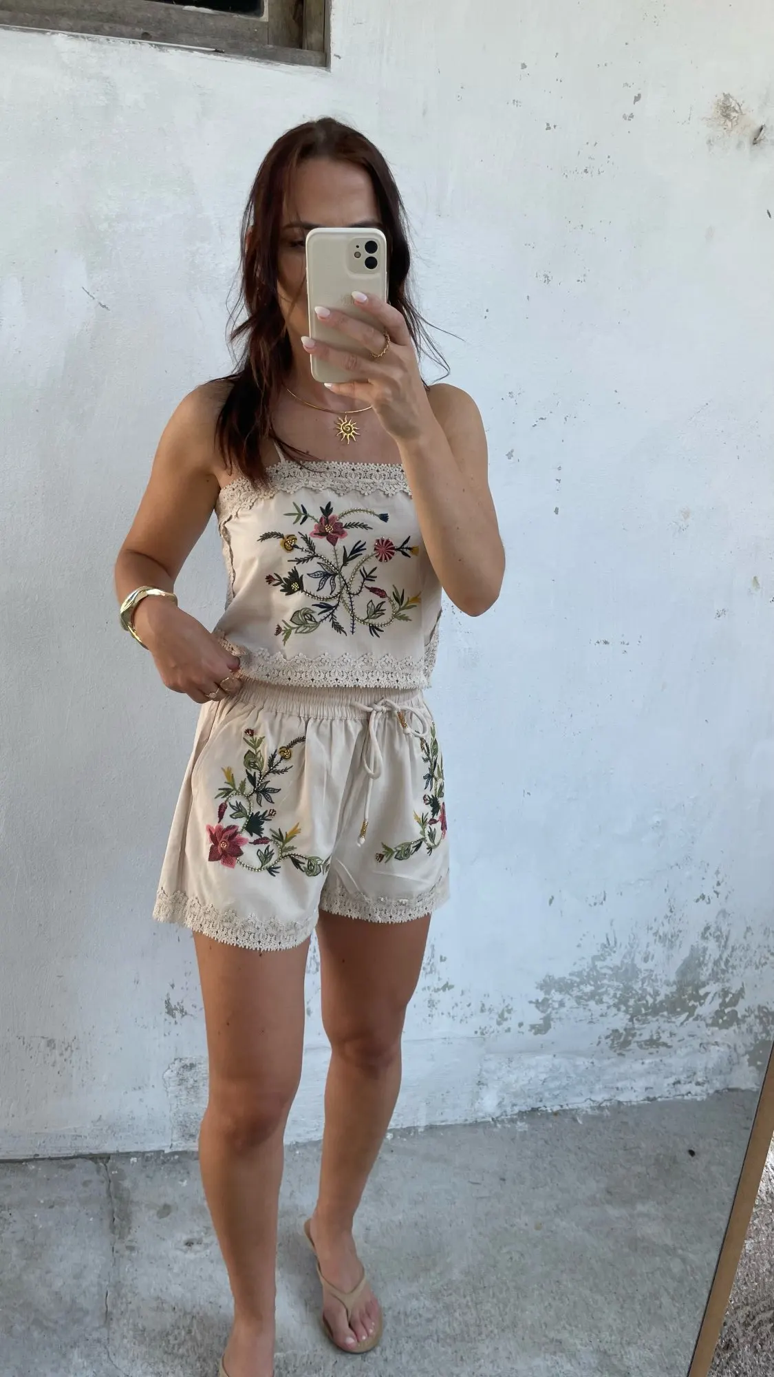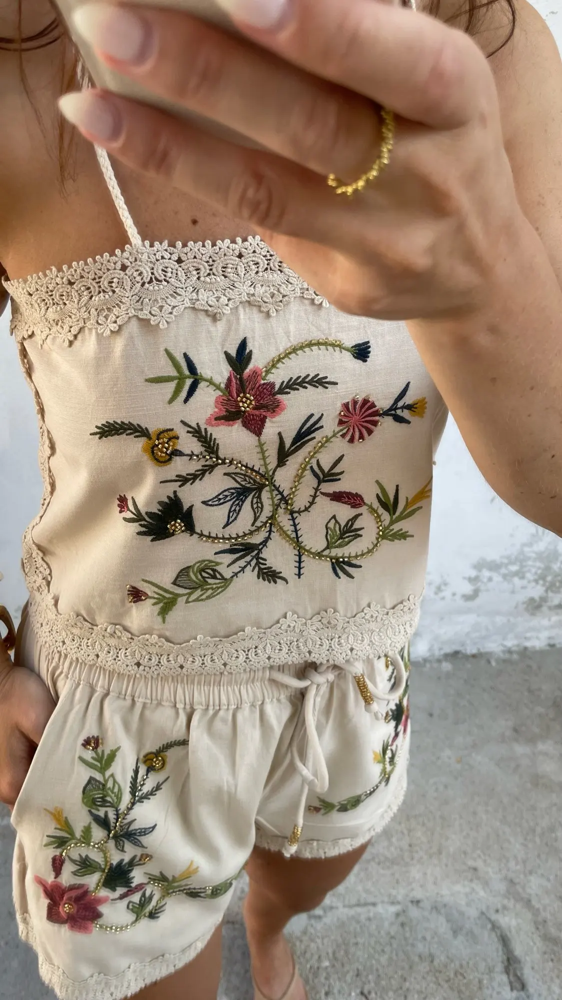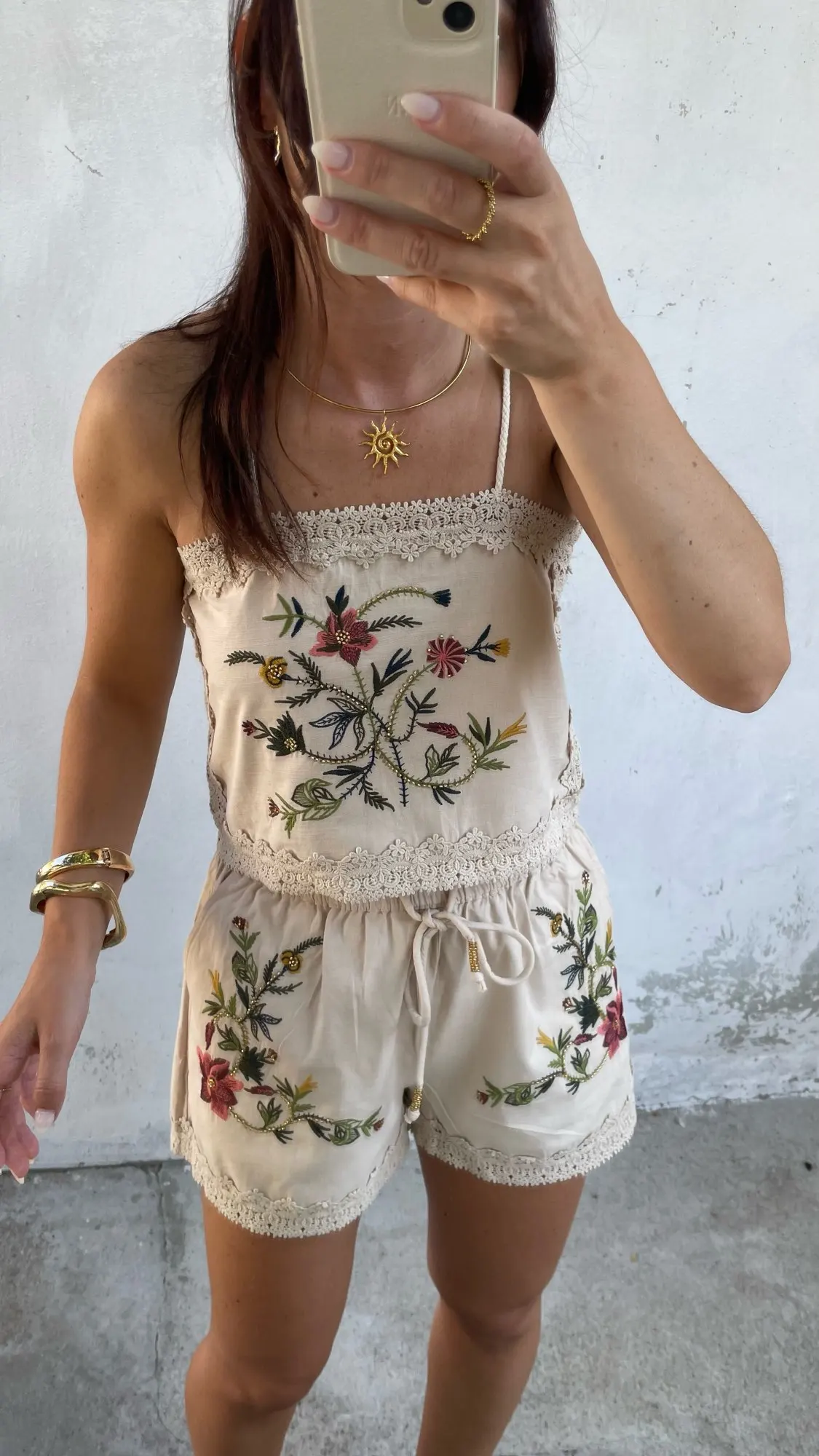 Elevate your summer wardrobe with the Vintage Floral Poplin Two-Piece Set, designed for juniors who appreciate a blend of refined style and comfort. This ensemble features a sleeveless halter top and drawstring shorts, crafted from lightweight poplin fabric to ensure breathability during warm days. The set is adorned with delicate lace and embroidery, enhancing its feminine charm and making it suitable for both casual and semi-formal occasions.