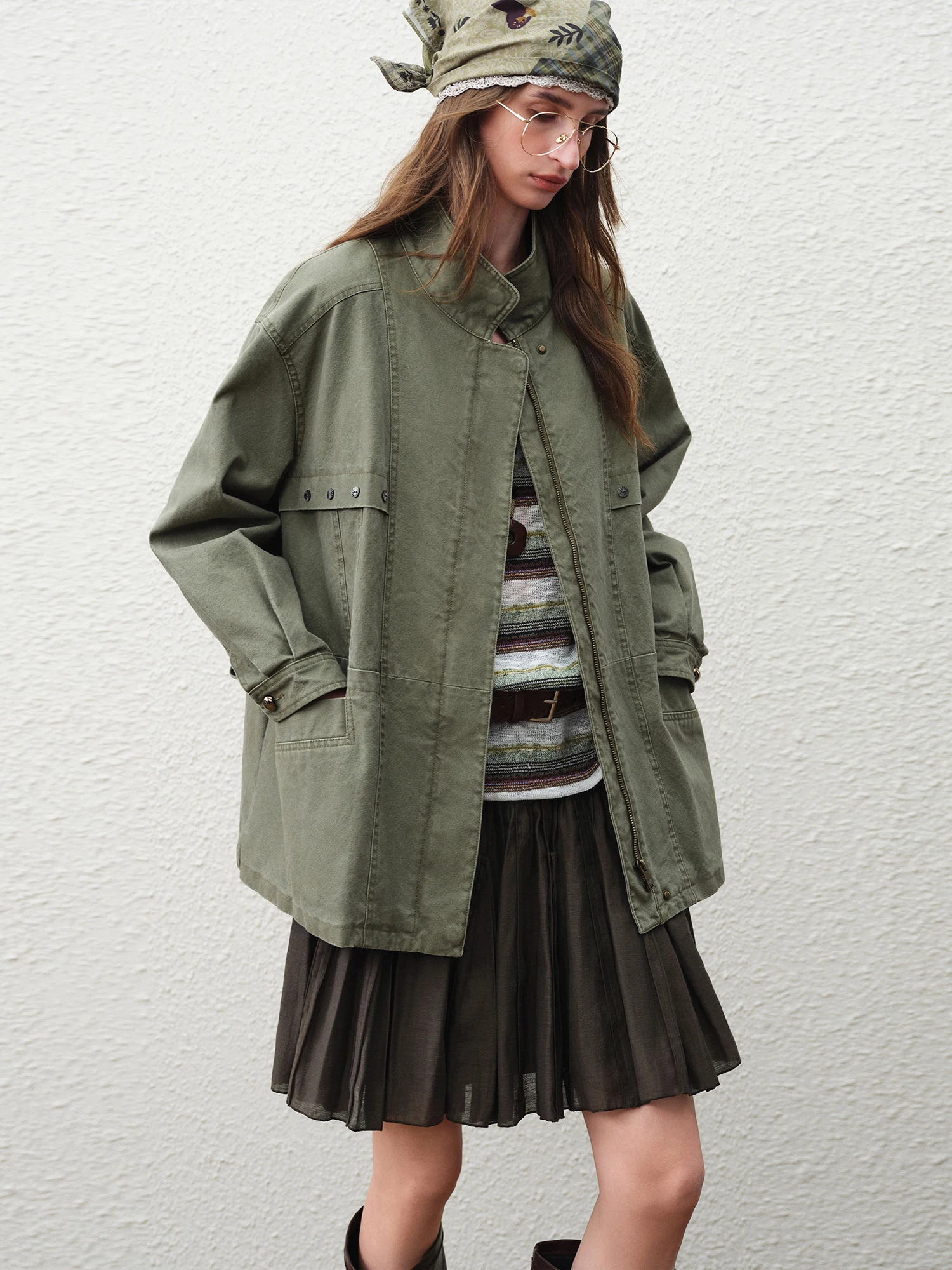 Embodying a blend of vintage utility and modern streetwear, the Vintage Utility Stand Collar Cotton Jacket in Army Green is designed for women who appreciate functional yet refined outerwear. Crafted from 100% cotton with a tatting weave, this jacket offers a breathable, structured feel ideal for transitional seasons such as spring and autumn.