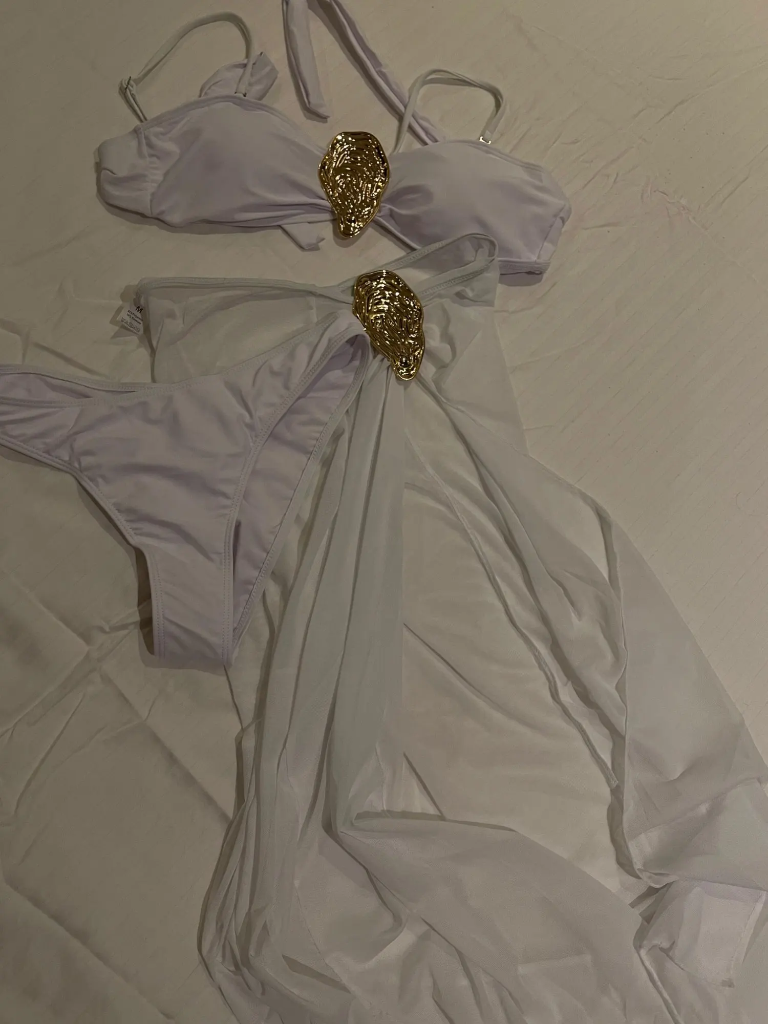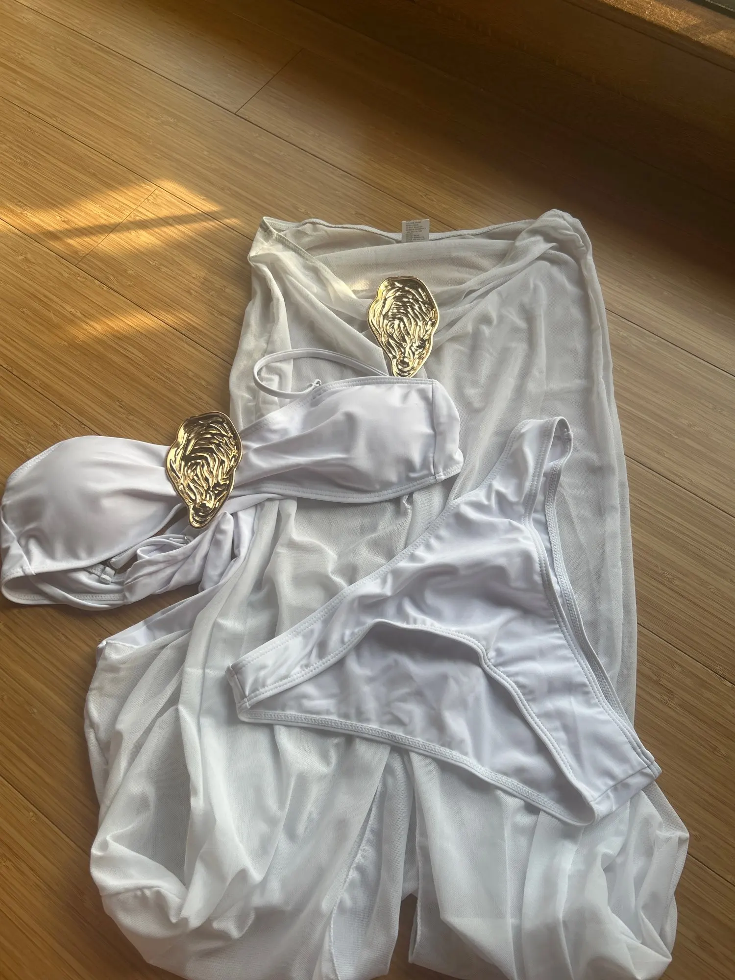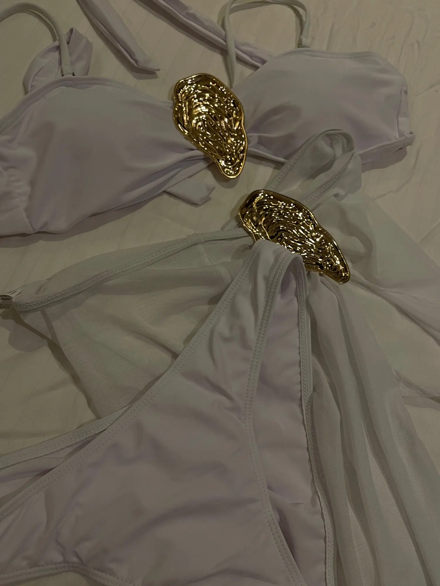 Vintage White 3-Piece Bikini Set – Mesh Skirt & Buckle Details