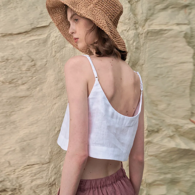 White Linen Crop Top with V-Neck and Slim Fit