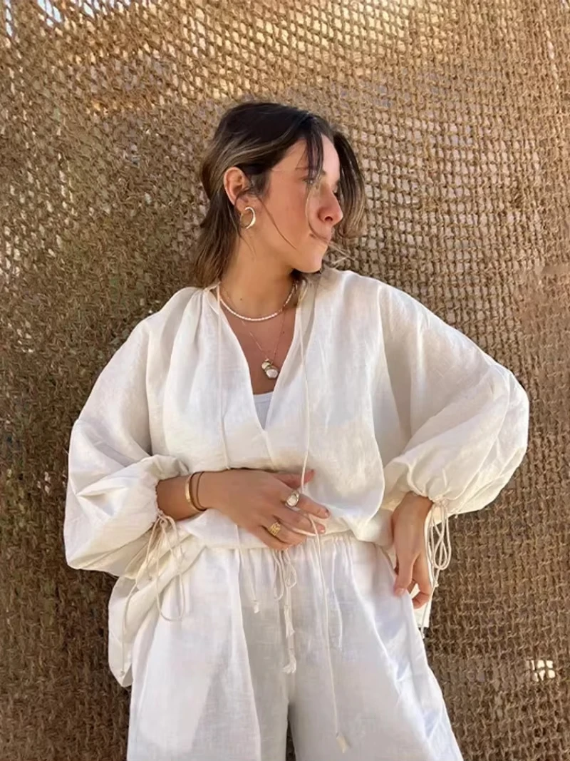 Luxurious cotton-linen blend set featuring a sophisticated V-neck pullover with elegant ruffle details and matching drawstring shorts. Breathable loose-fit design perfect for warm weather comfort. Available in classic blue and white. Professional office-ready styling meets relaxed summer sophistication. Machine washable convenience with timeless appeal.