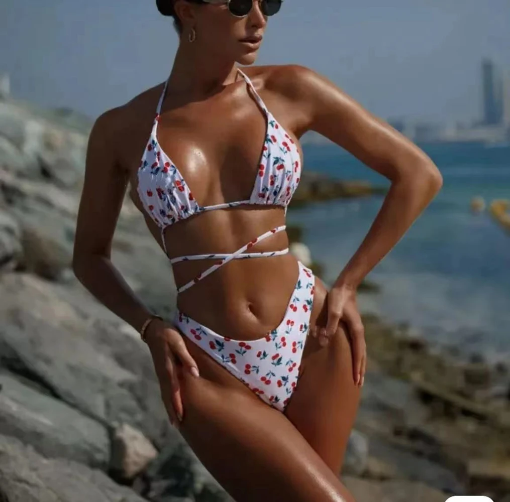 Indulge in Summer Elegance with the Leopard & Cherry Print Women’s Halter Bikini Set