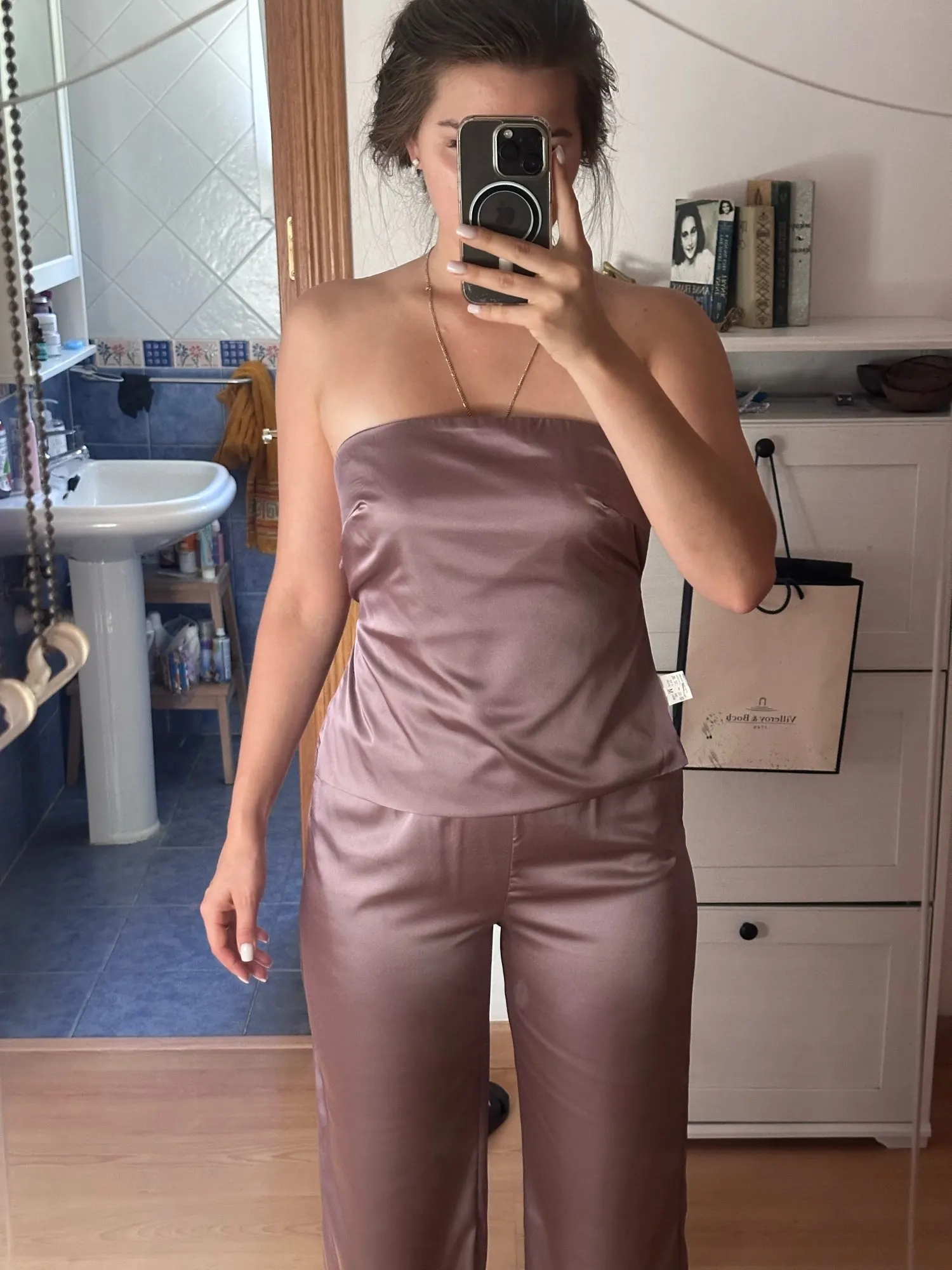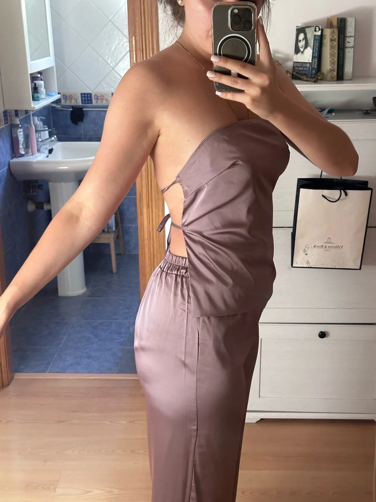 17 reviews for Satin Backless Crop Top & Wide Leg Pants Set for Parties