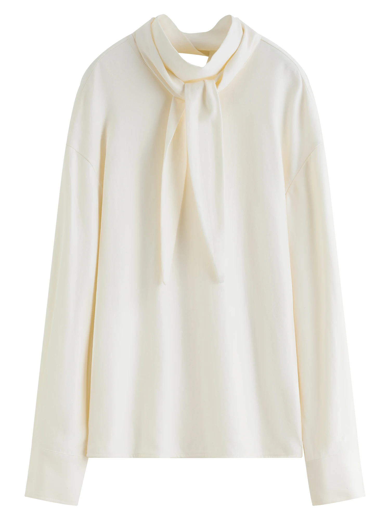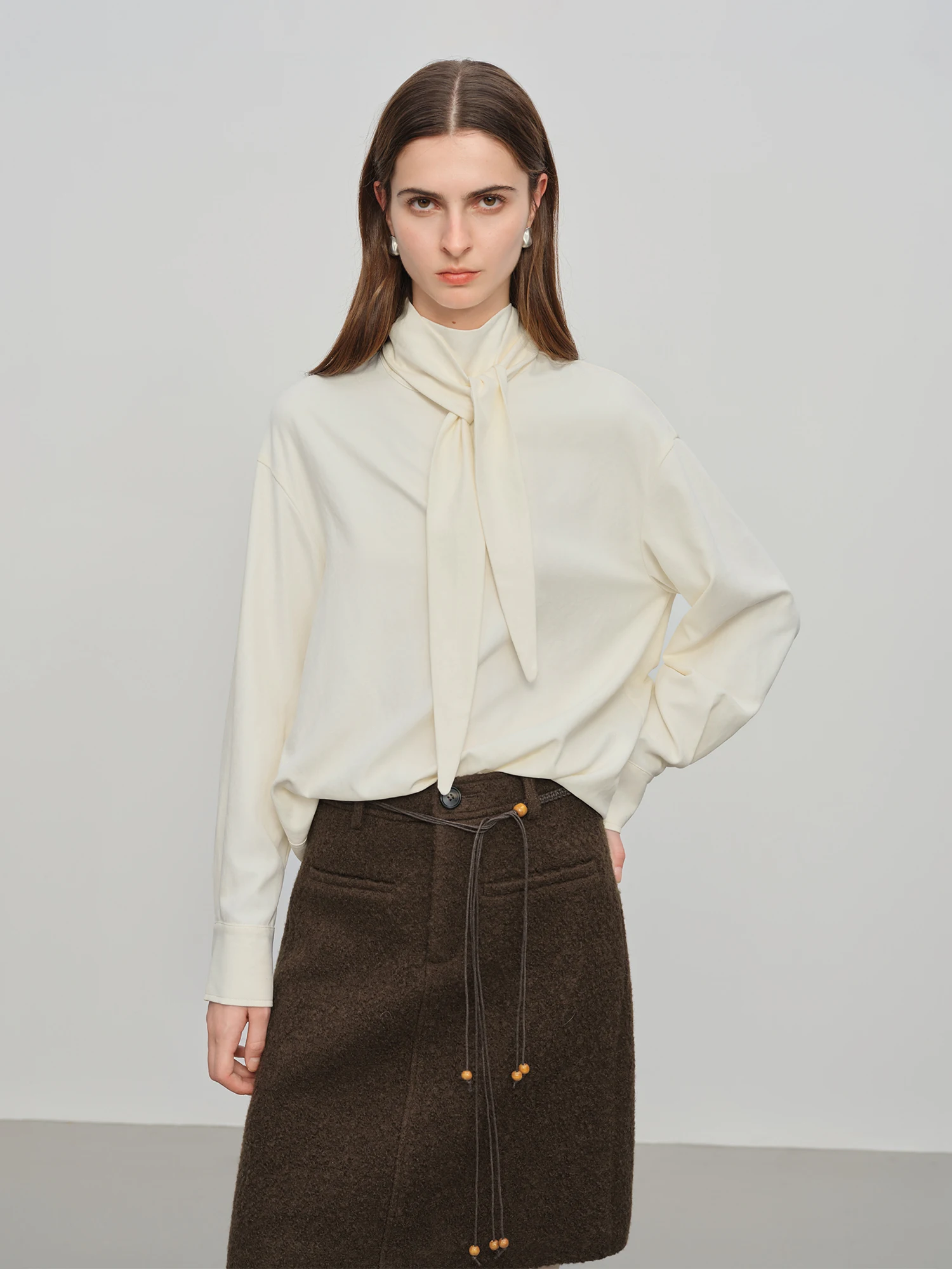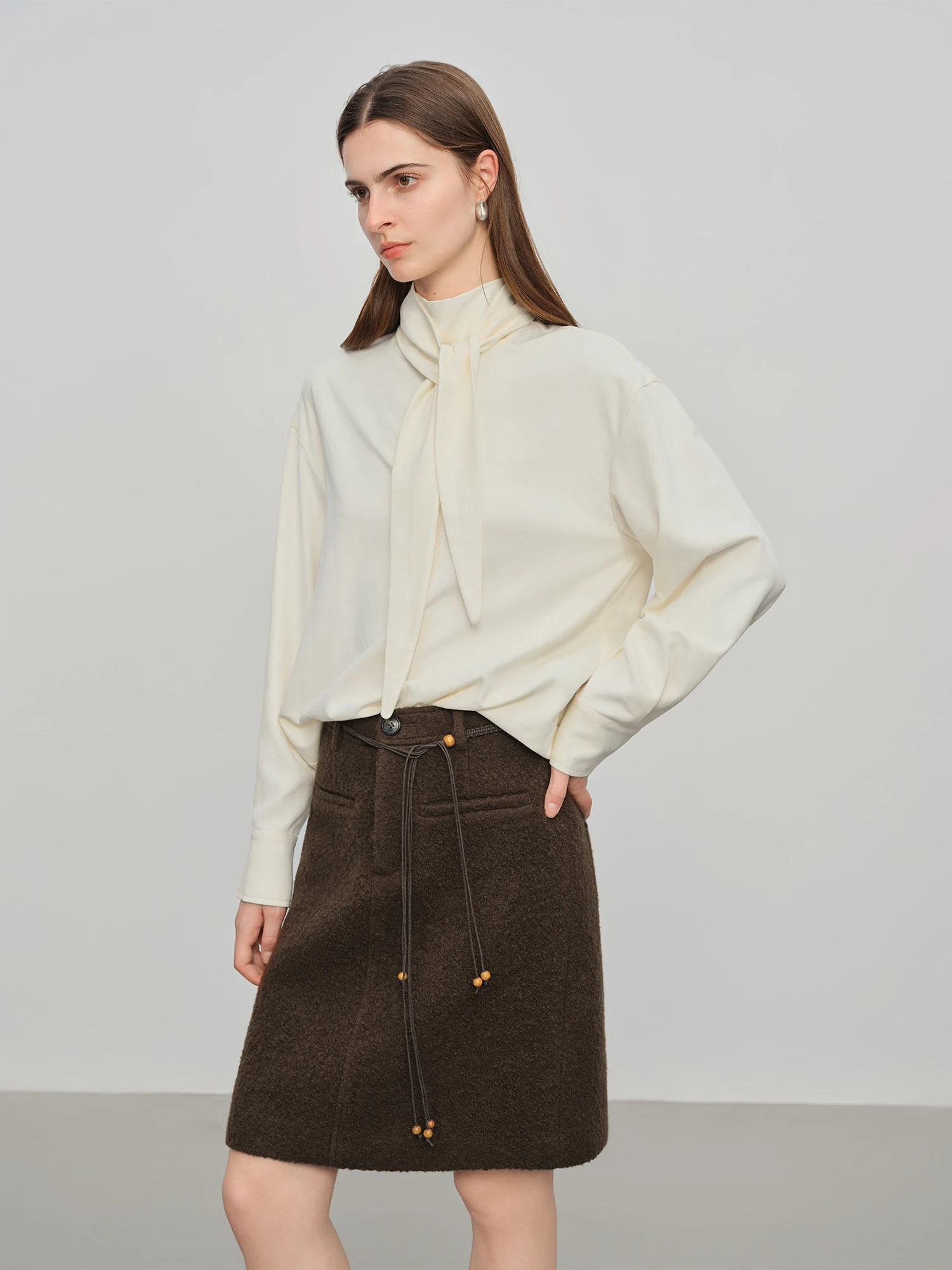 Introducing a refined addition to your autumn and winter wardrobe, this beige pullover blouse balances classic design with delicate detailing. Crafted from a blend of 51.8% polyester fiber and 48.2% polyester/polyamide composite fiber, the fabric offers a broadcloth texture with a subtle stretch, ensuring both comfort and a gentle drape. The blouse features a unique ribbon detail alongside an irregular hollow design, lending understated visual interest without overwhelming the minimalist silhouette.
