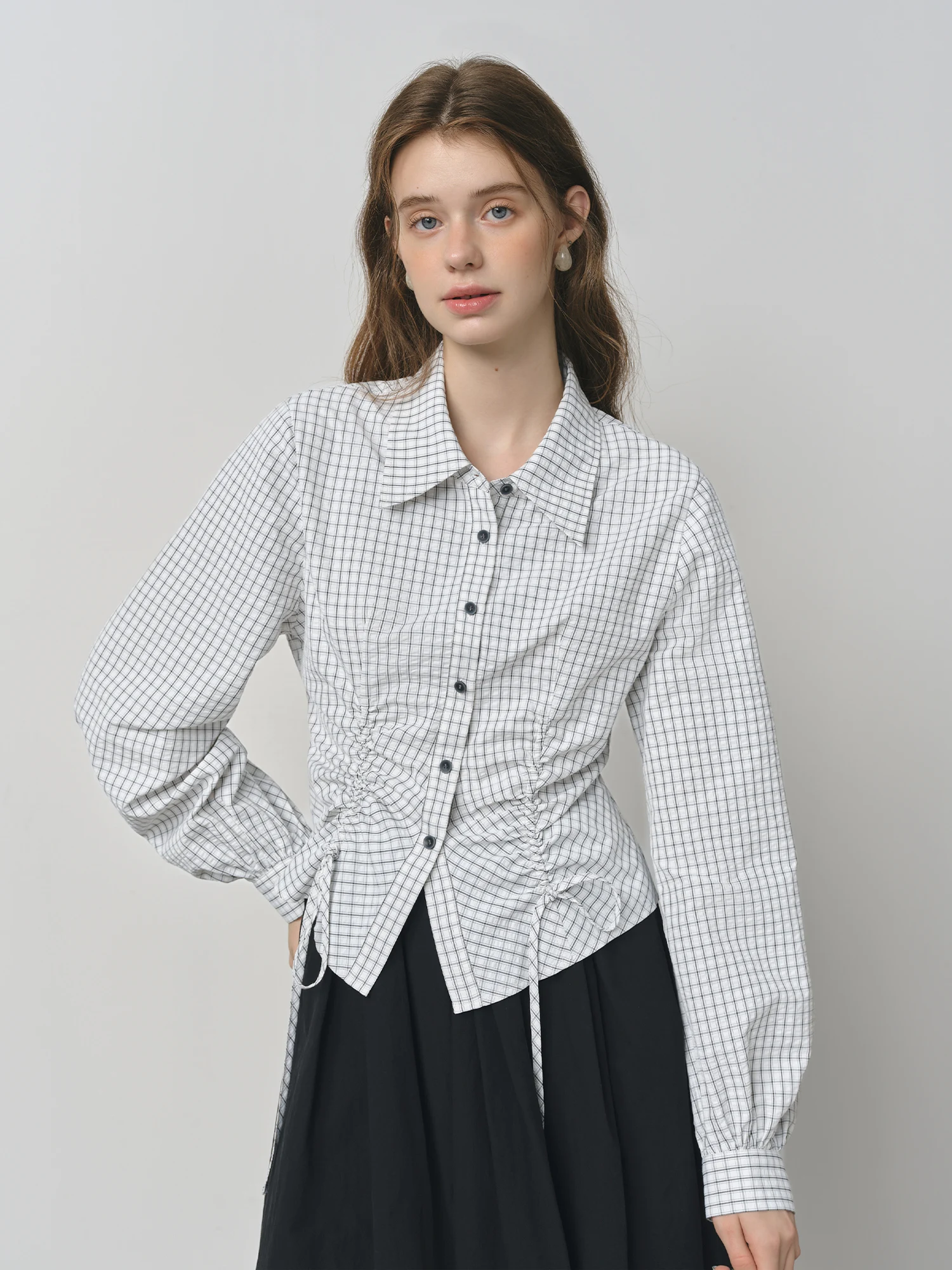 Women’s Black Plaid Long Sleeve Shirt with Waist Tie