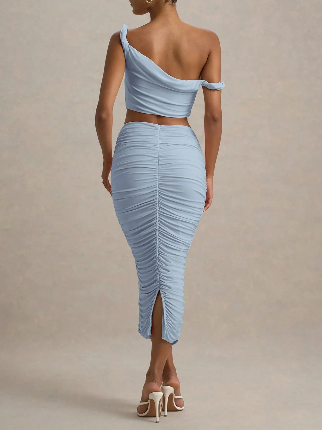 Get ready to turn heads and embrace your inner elegance with our Stunning One Shoulder Blue Midi Dress Set, where every detail is tailored to move with you and celebrate your natural beauty.
