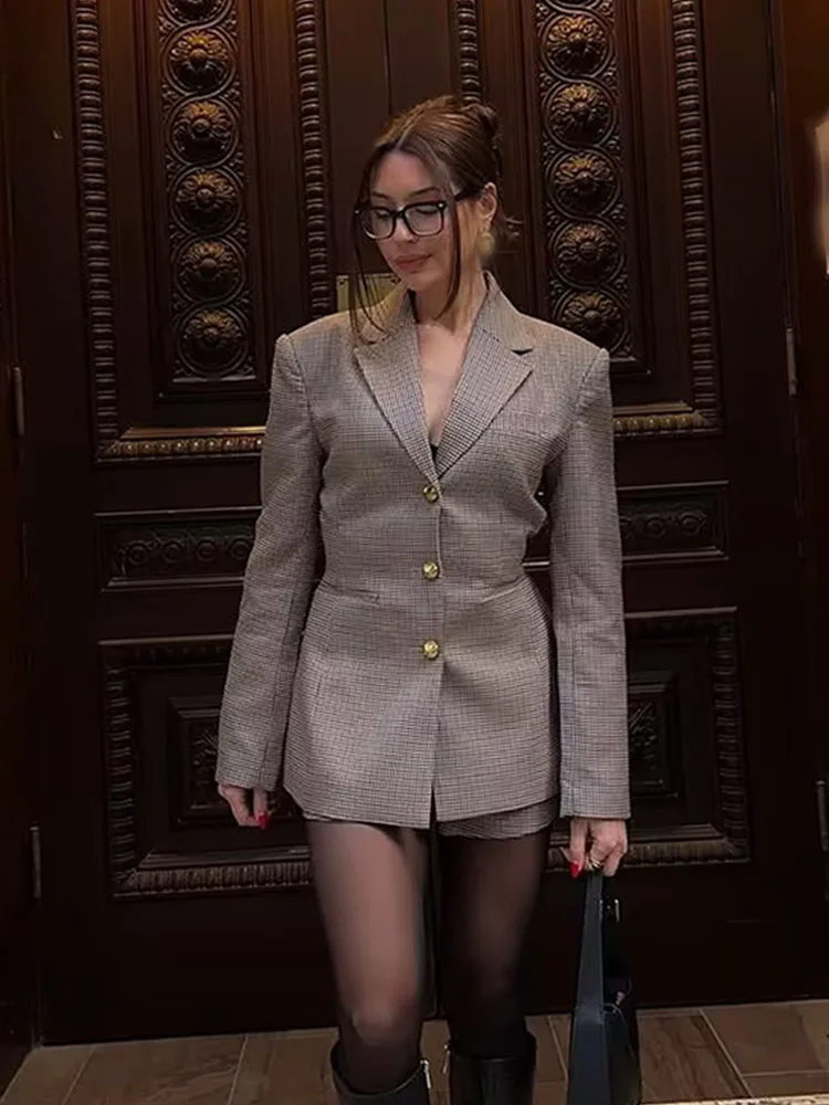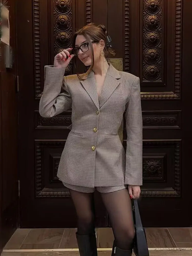 Women’s Khaki Houndstooth Blazer with Turn-Down Collar
