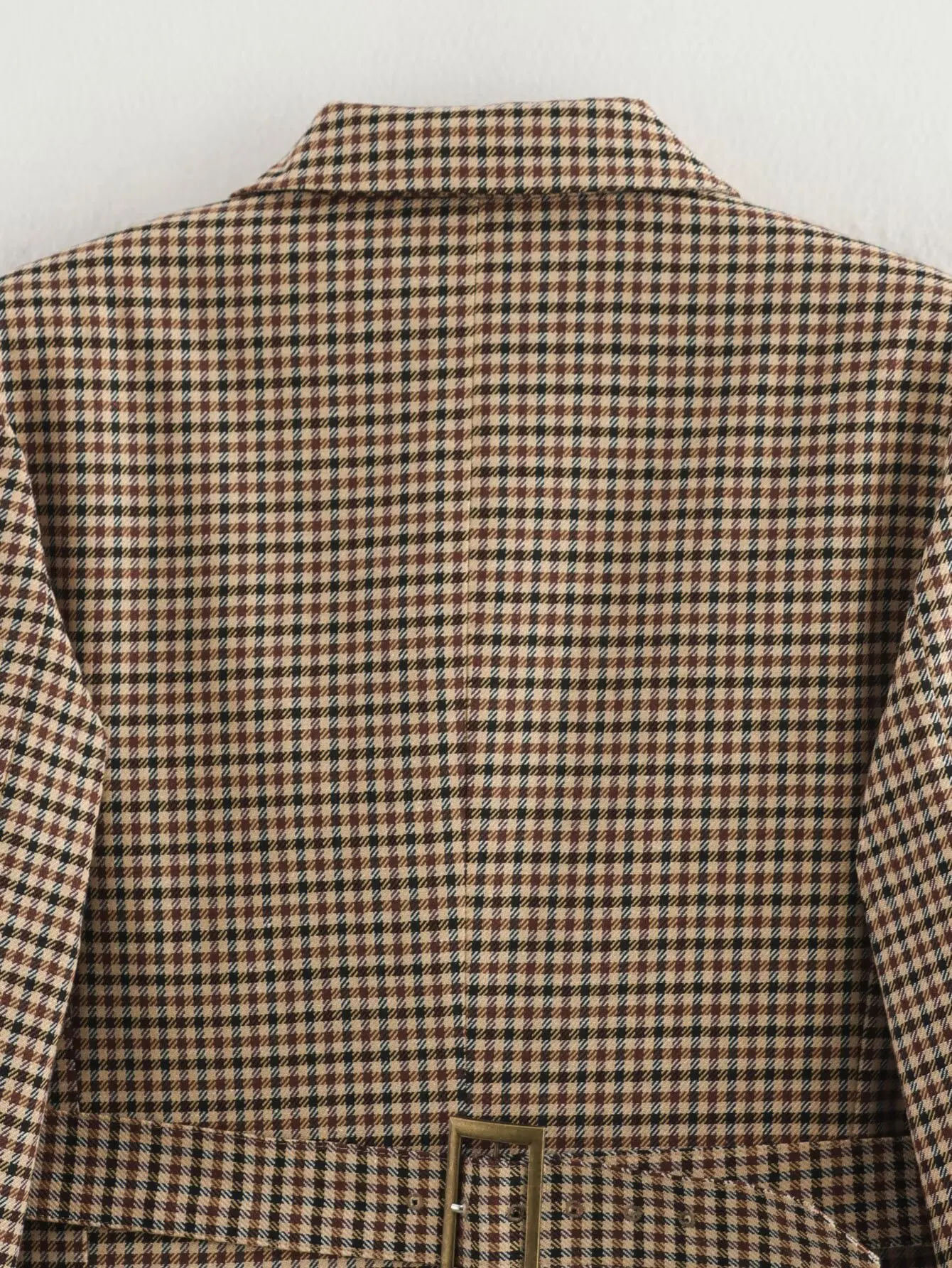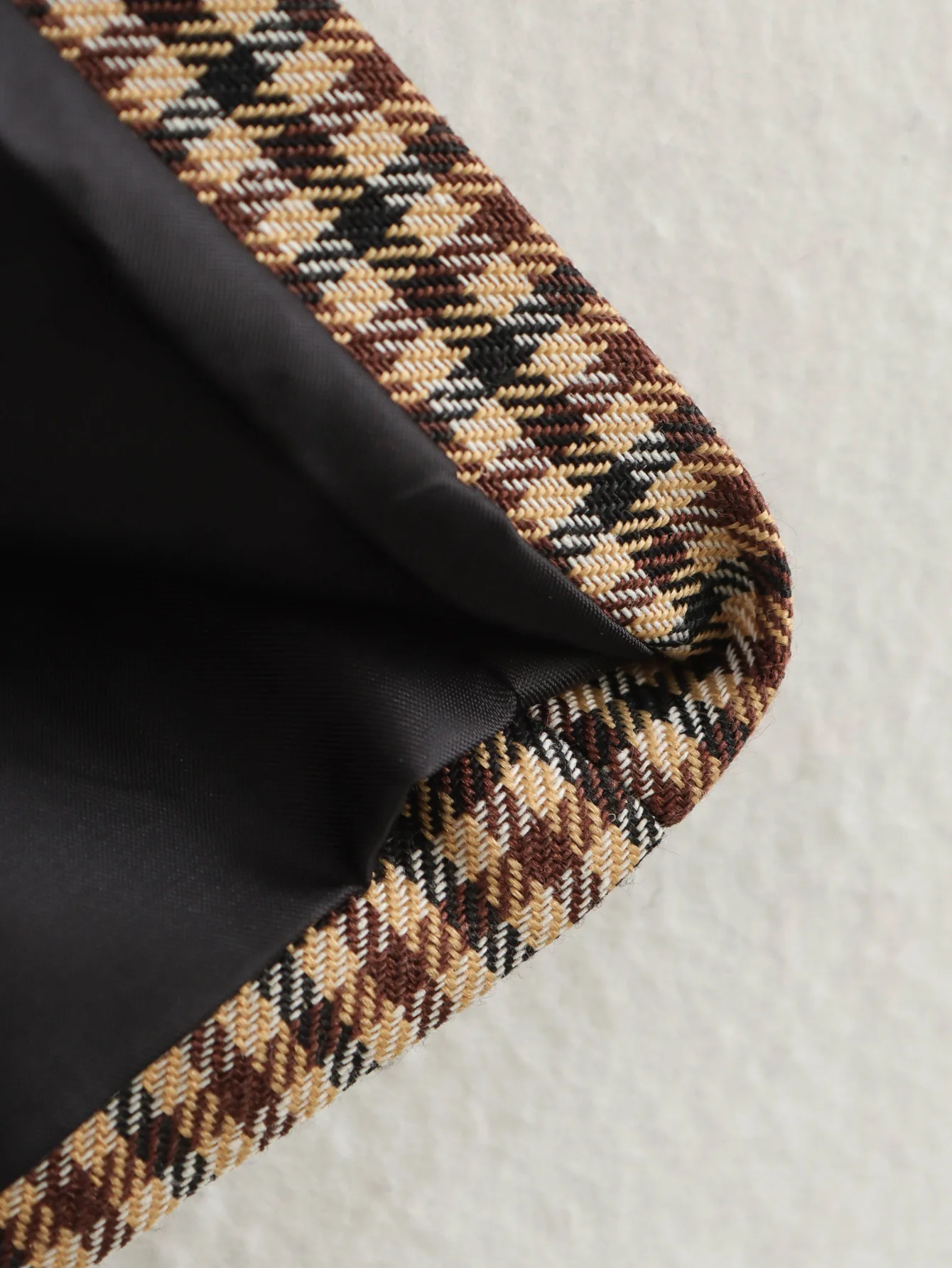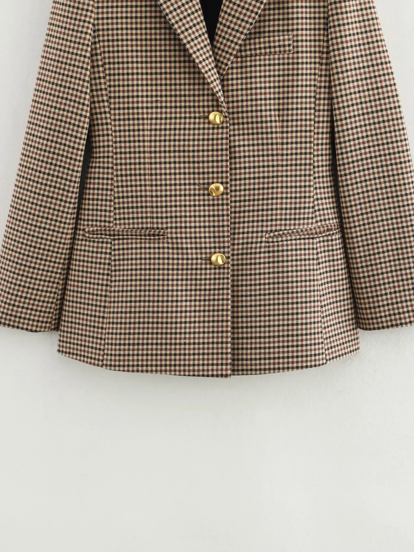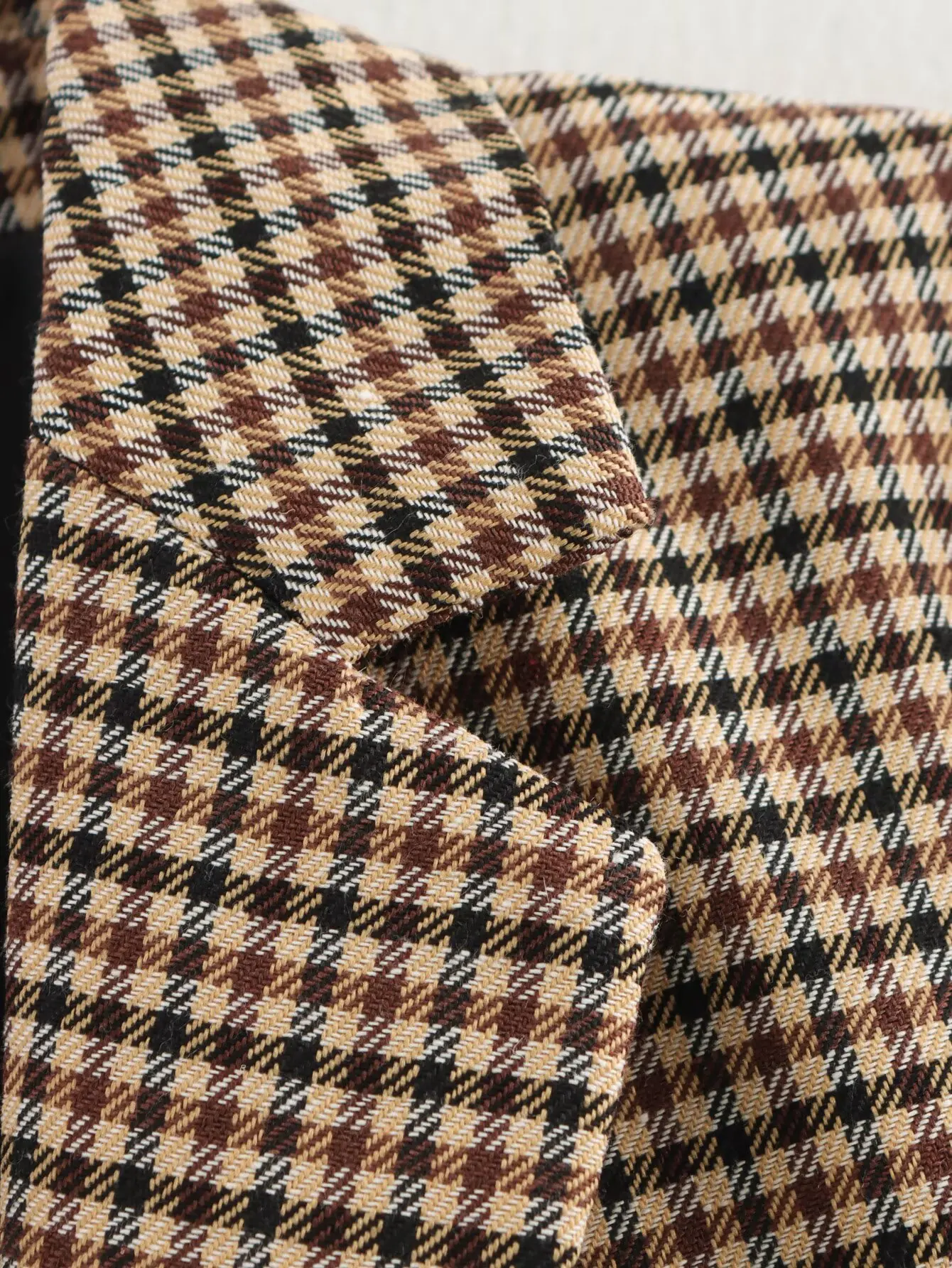- Pattern: Khaki houndstooth plaid, offering subtle texture and visual interest.