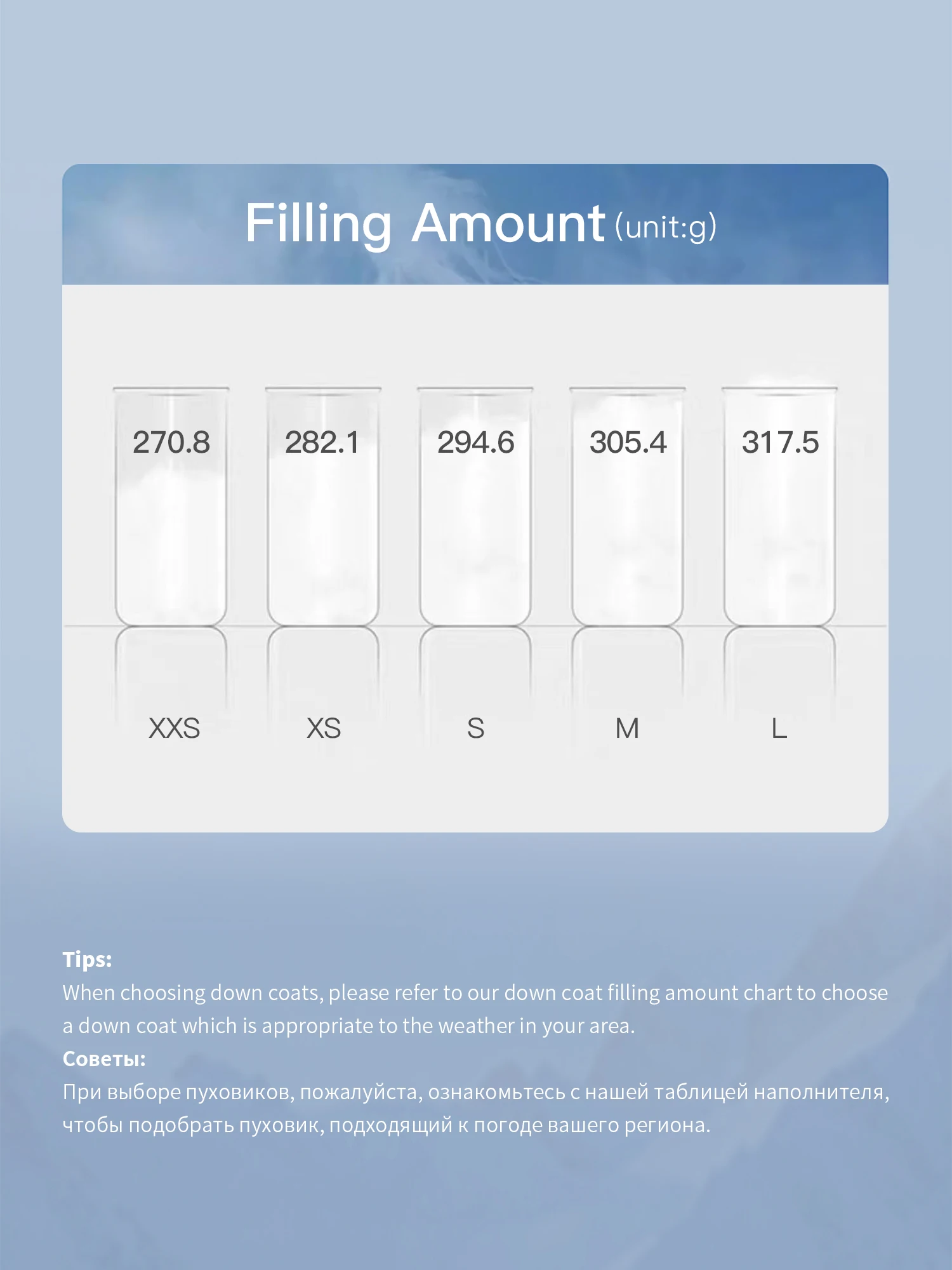 - Insulation: 90% white duck down filling weighing between 250g-300g for effective warmth.