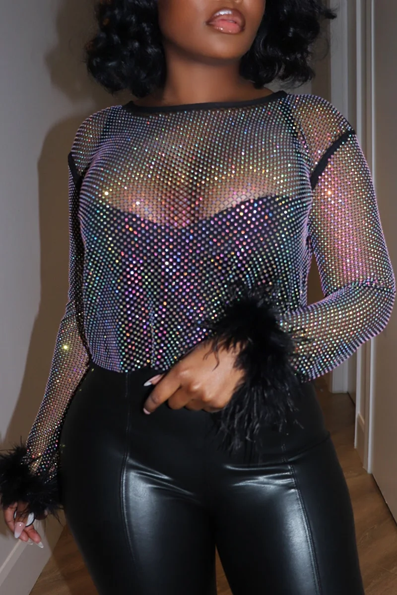This stunning top is not just a piece of clothing; it’s a celebration of style and individuality. The combination of sheer fabric, ornate feather detailing, and delicate sequins creates a captivating look that transitions effortlessly from casual outings to festive gatherings. Pair it with your favorite jeans for a chic streetwear vibe, or team it with a sleek skirt for an elegant evening affair.