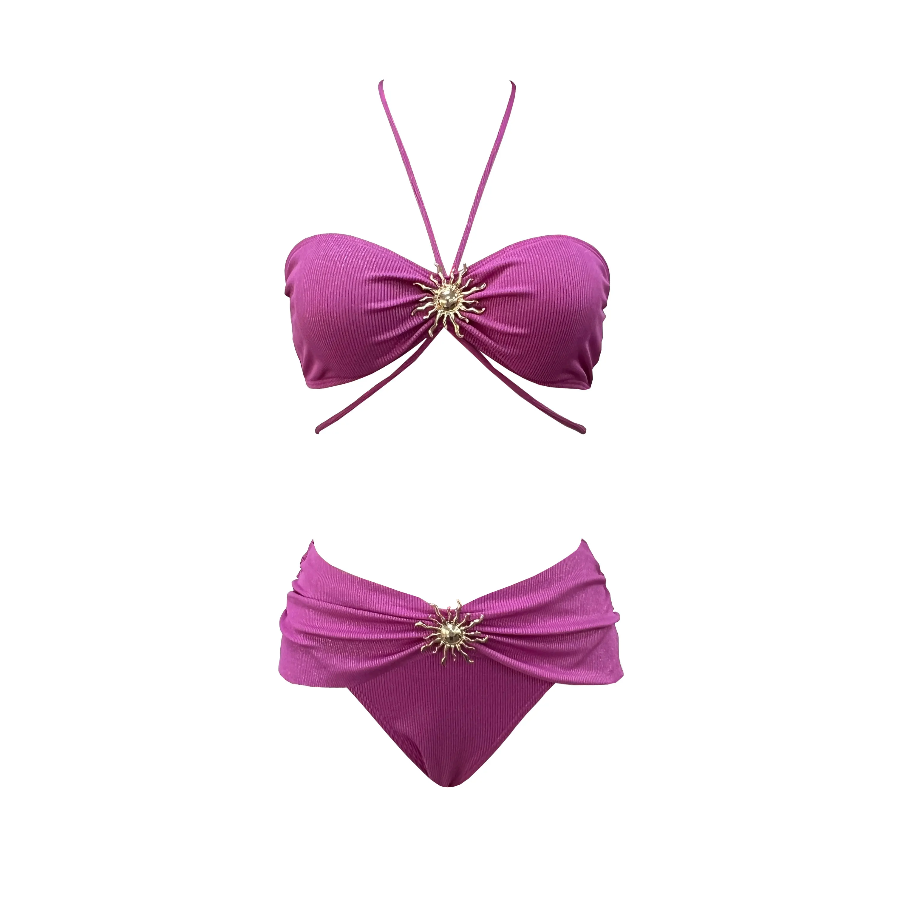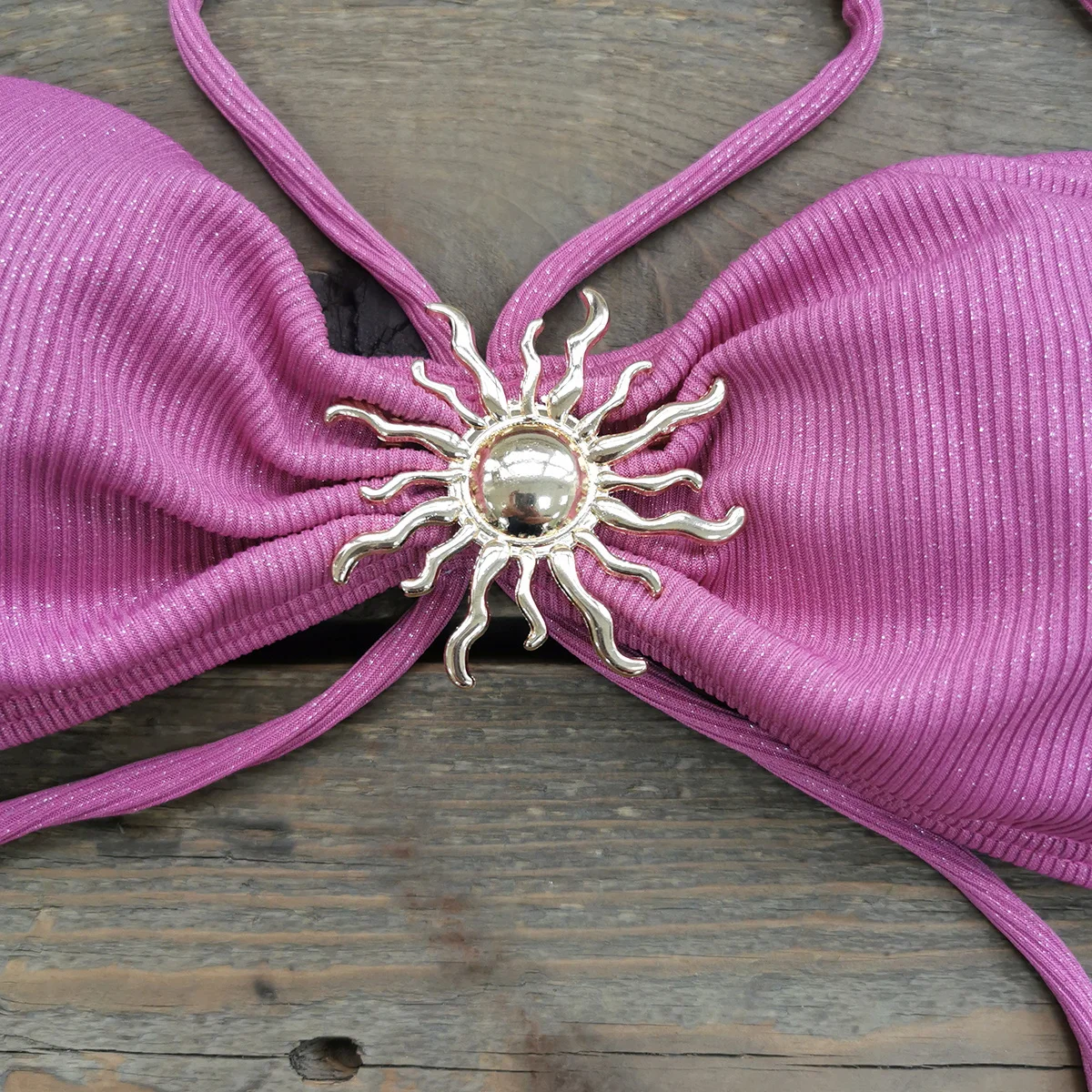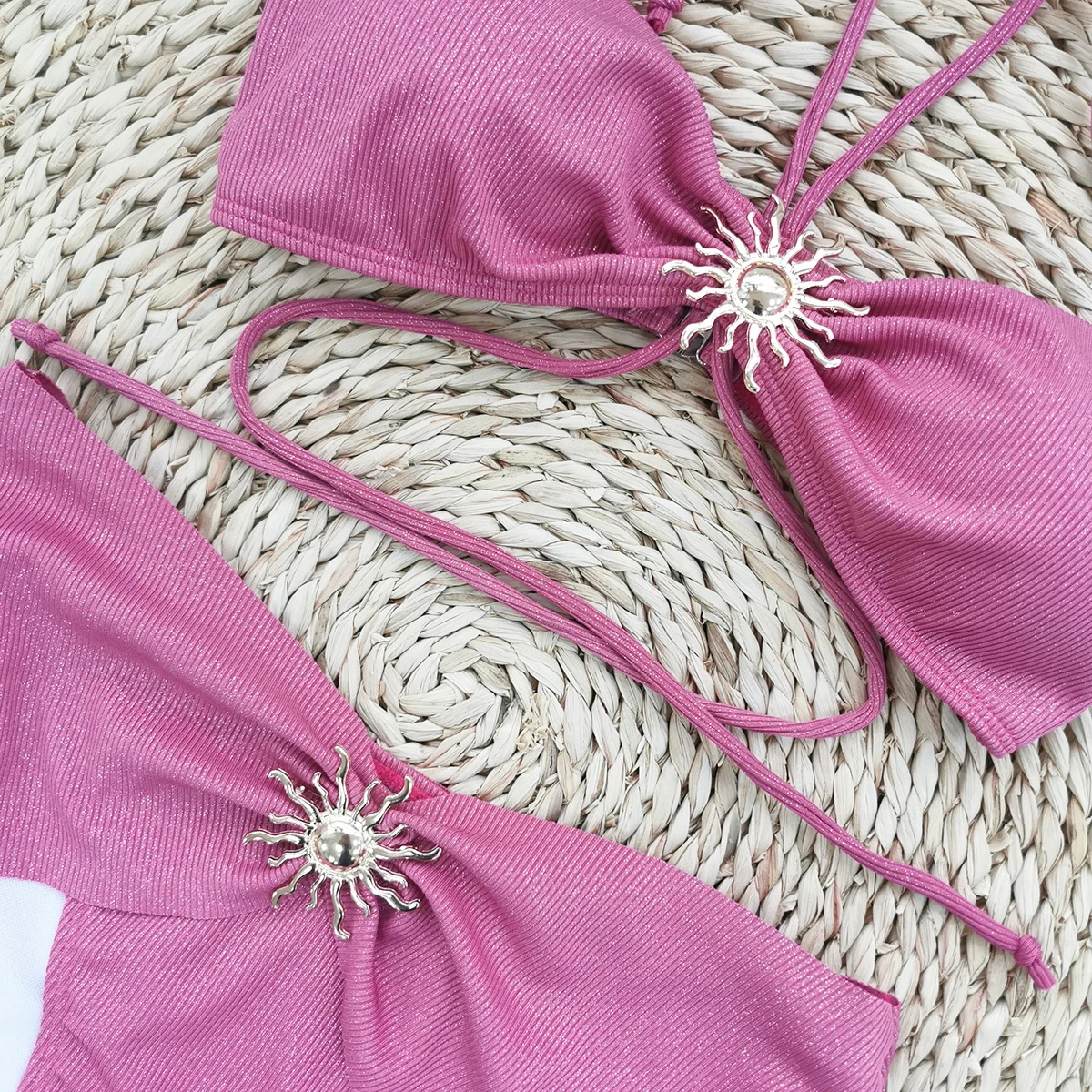 - Mid-waist bottoms with subtle knotted accents