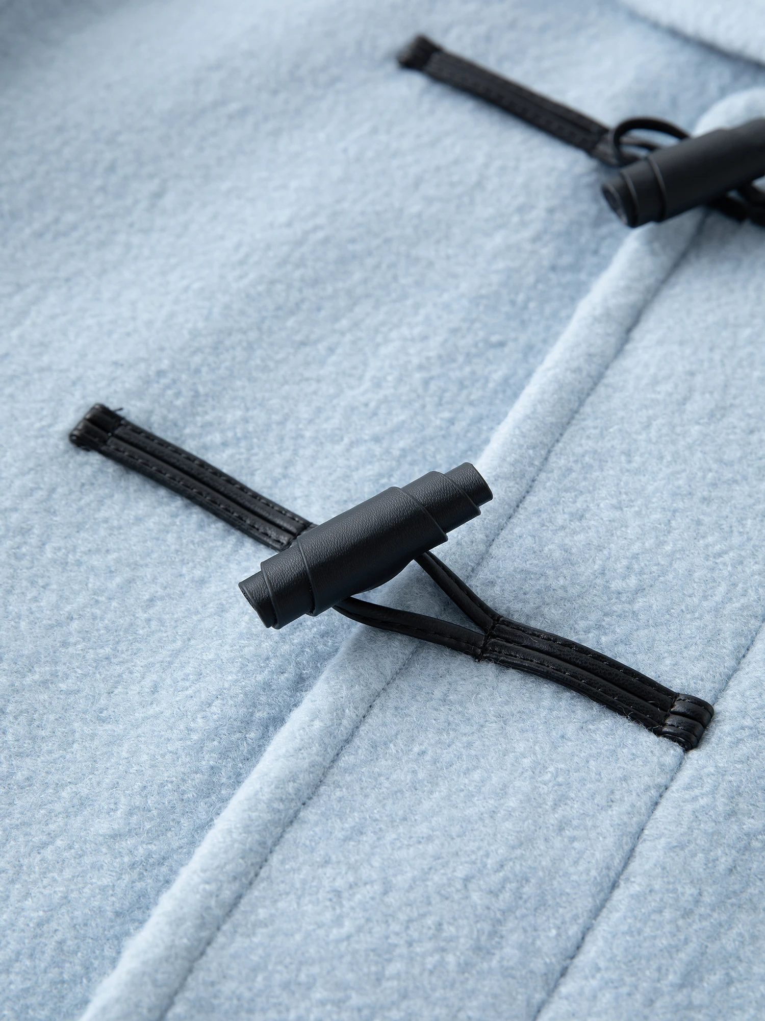 The turtleneck collar and horn button closures add subtle sophistication, while the regular fit accommodates layering with ease. Available in muted green and sky blue, it pairs effortlessly with tailored trousers or a fitted dress for polished winter styling.