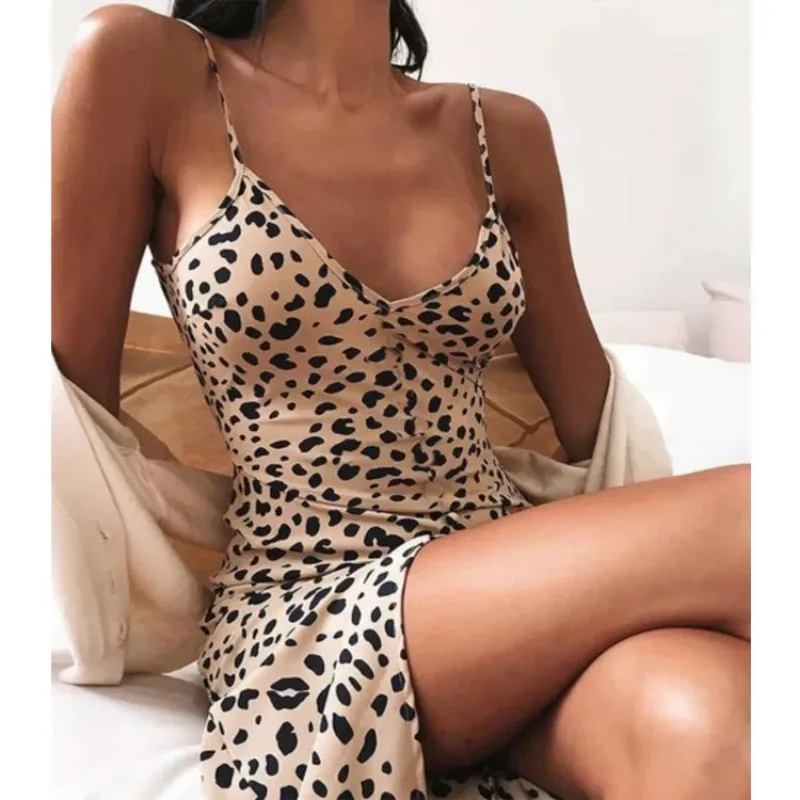 Unleash your wild side with this Leopard Print Suspender Dress, designed for every body. Crafted from soft, slightly stretchy polyester, this mini dress features a captivating V-neck and delicate spaghetti straps for an alluring silhouette. Available in stunning colors, it's the perfect choice for summer outings or club nights. Embrace your confidence and make a statement!