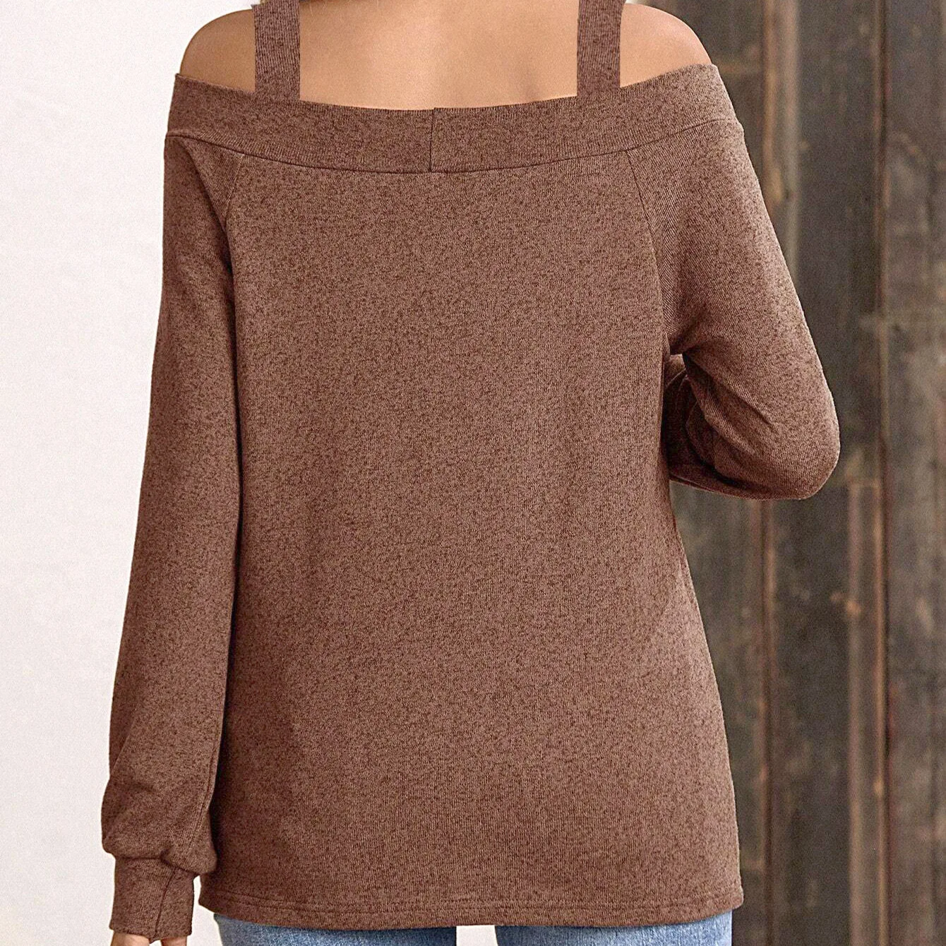 Sophisticated off-shoulder design meets timeless elegance in this versatile long-sleeve top. Crafted from premium blended polyester with medium stretch for comfortable movement. The solid brown hue and streamlined silhouette create a refined look perfect for any occasion. Features regular sleeve styling and true-to-size fit. Available in S-XXL sizes for the perfect match. Transform your wardrobe with this essential piece that transitions seamlessly from casual to polished looks.