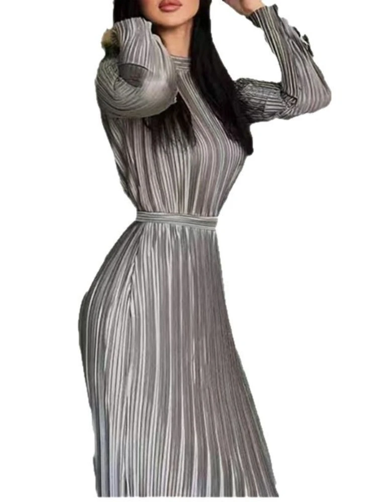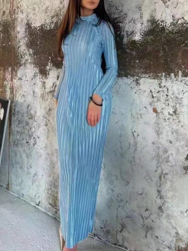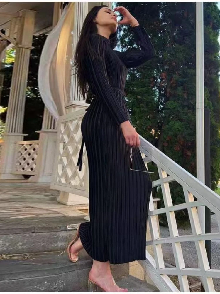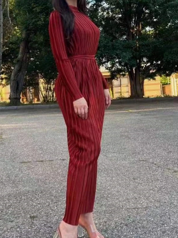 Embrace timeless elegance with this Women's Solid Color Knitted Dress. Crafted from luxurious natural fibers, it features a half high collar and a flattering natural waistline. The ankle-length, pleated silhouette drapes beautifully, while full sleeves add sophistication. Perfect for all seasons, this dress is a versatile addition to your wardrobe. Available in stunning colors like black, burgundy, and creamy-white. Make a statement effortlessly.