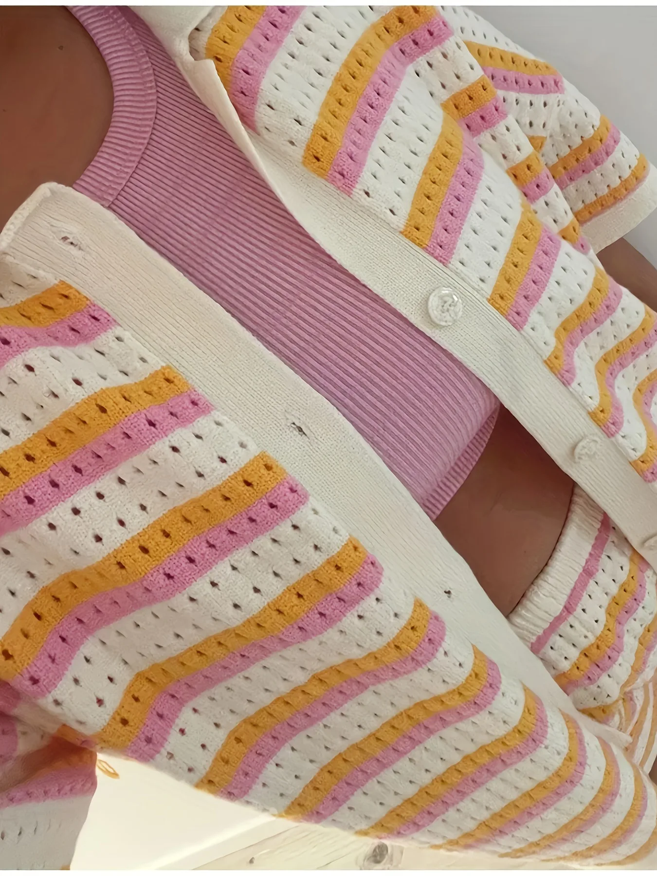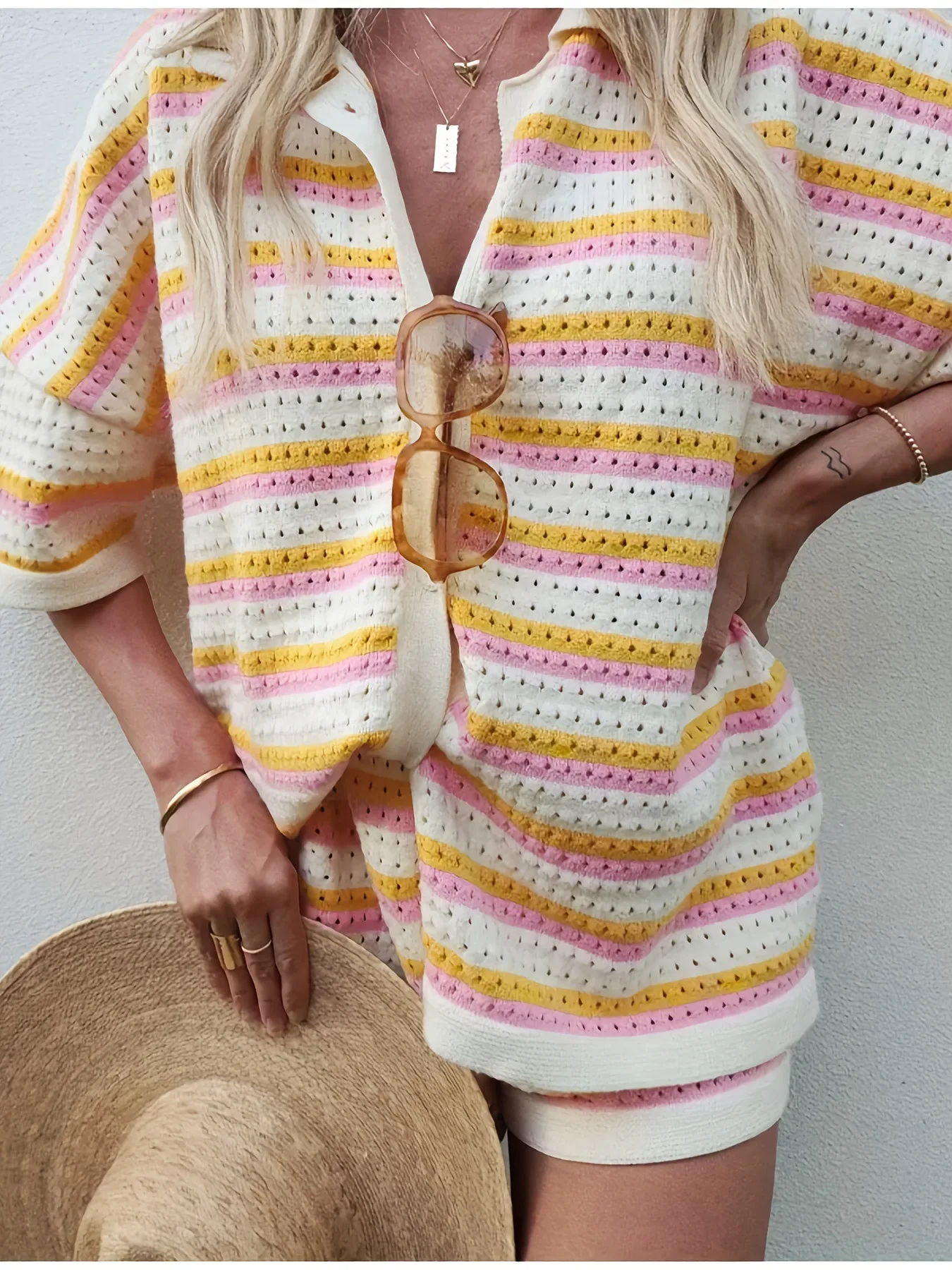 Luxurious striped button-up tee and shorts set crafted from premium polyester-spandex blend. Features sophisticated V-neck design with hollow-out details and comfortable loose fit. High-stretch fabric ensures all-day comfort while maintaining refined streetwear style. Available in multiple sizes.