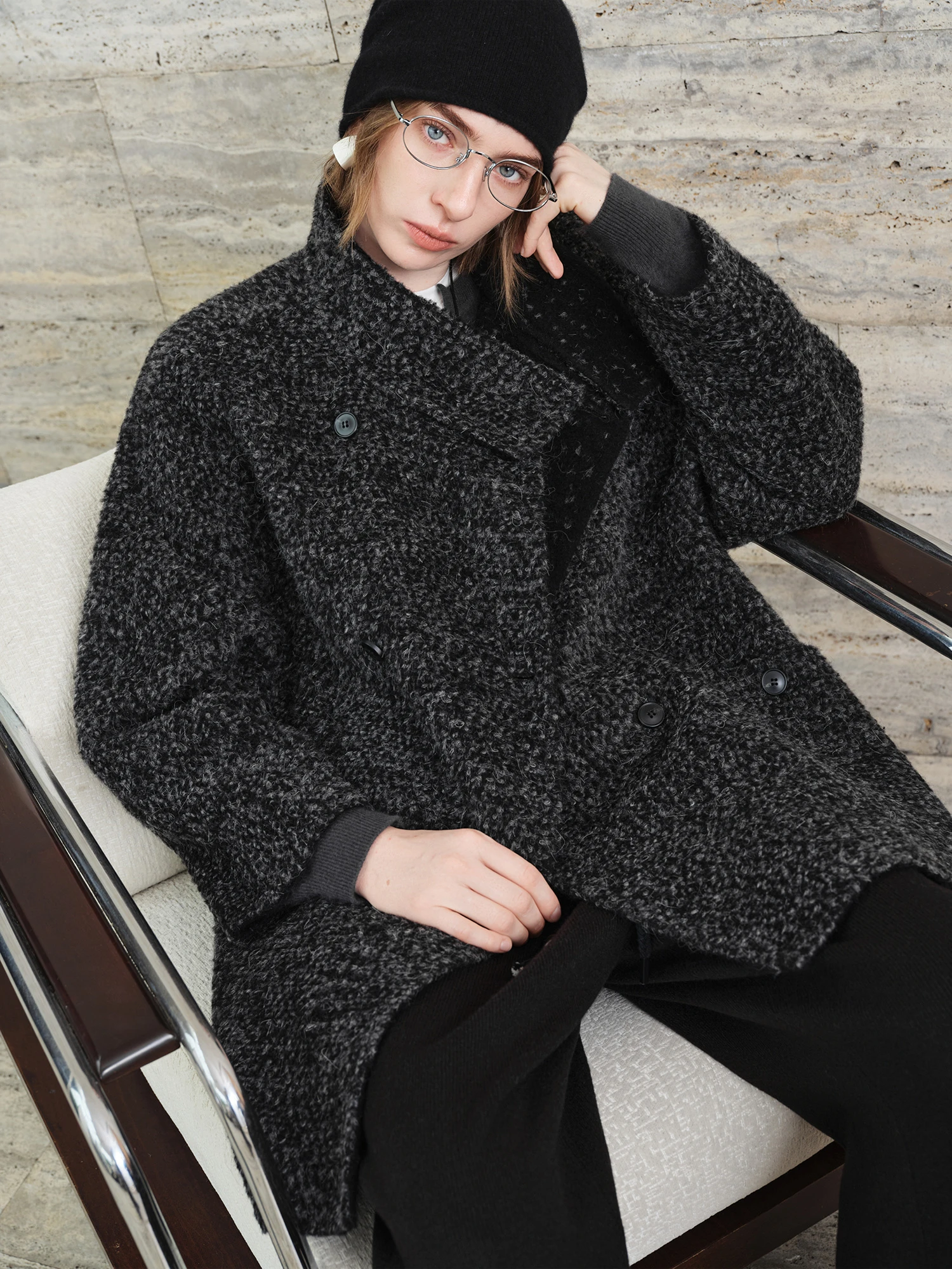 Women’s Tweed Wool Blend Turtleneck Overcoat – Mid-Length Winter Coat