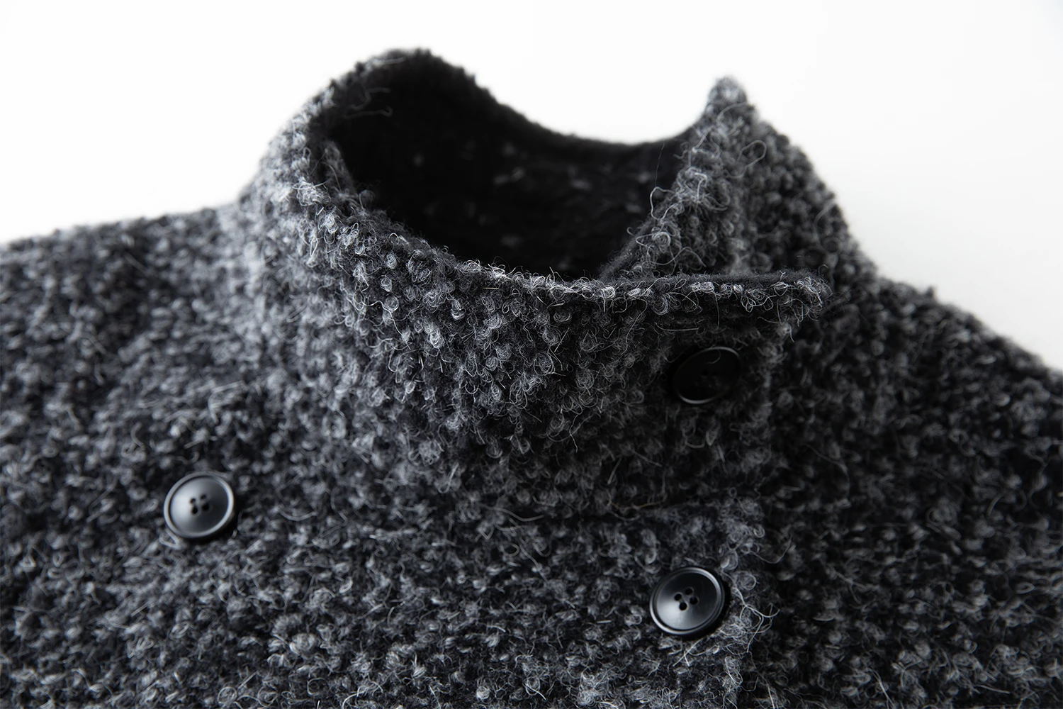 Q? What materials compose this coat?A It is made from a blend of 86.6% sheep wool, 9.2% alpaca wool, and 4.2% nylon, providing warmth and a soft texture with subtle resilience.