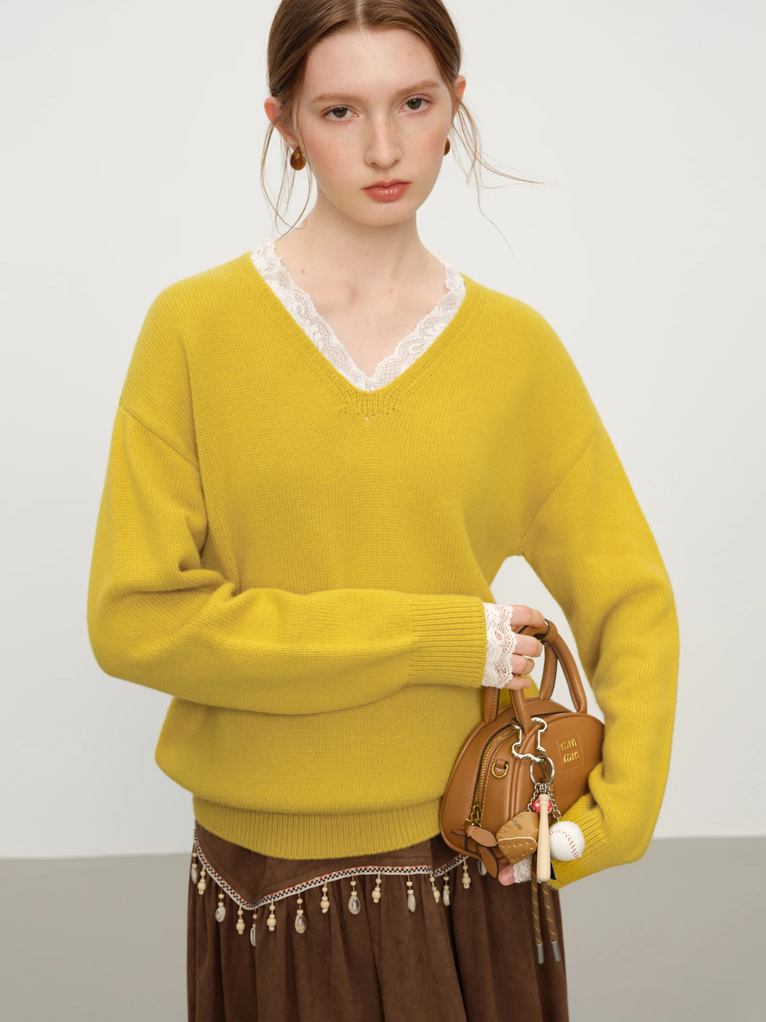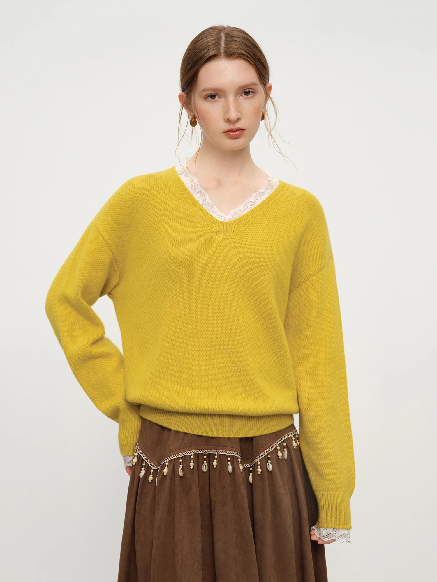 Designed for the modern woman seeking refined comfort, this V-neck lace knit sweater offers a relaxed fit that drapes elegantly. Crafted from a wool blend featuring nylon and acrylic, it provides subtle stretch and medium-weight warmth — ideal for winter office wear.