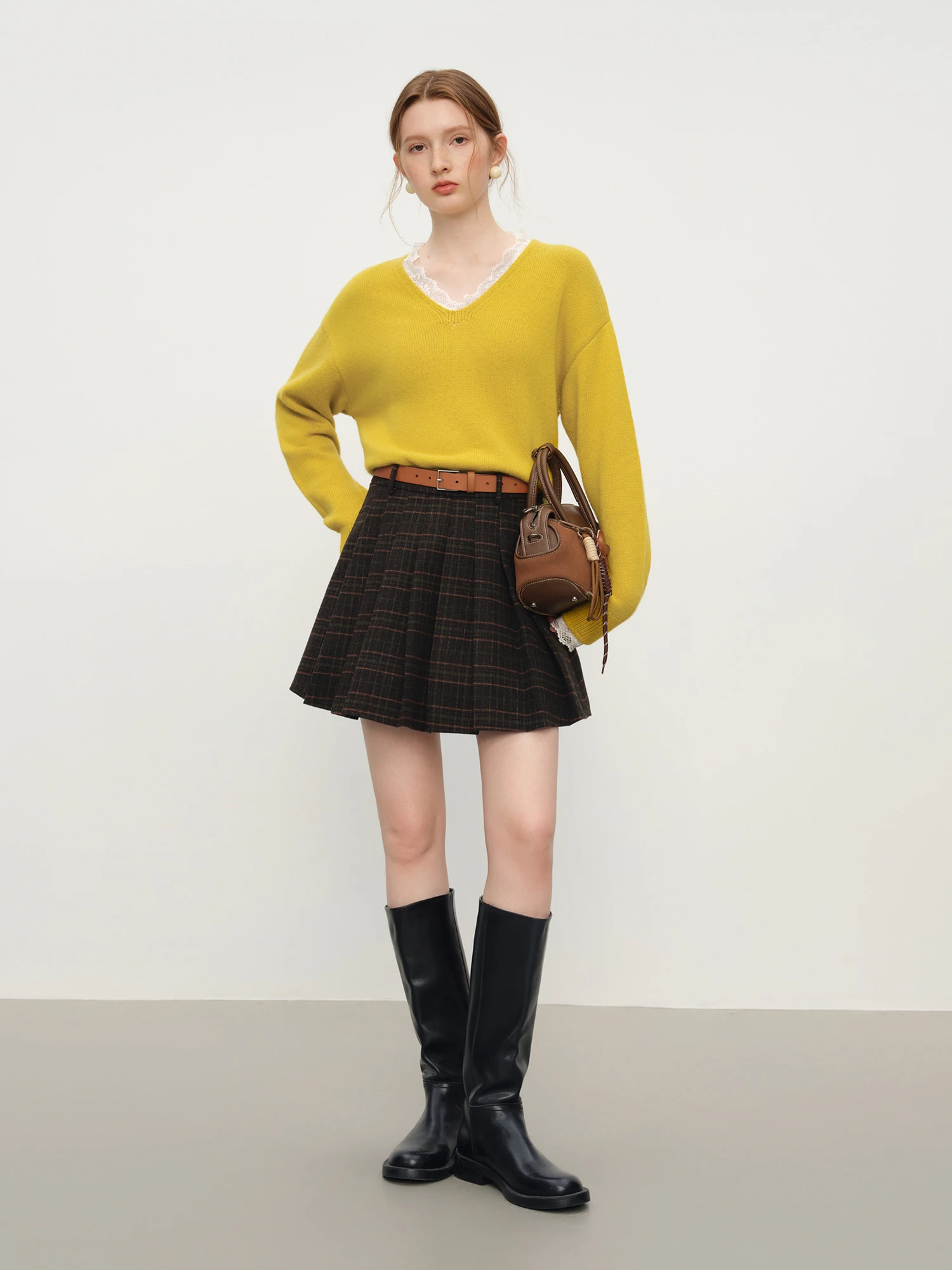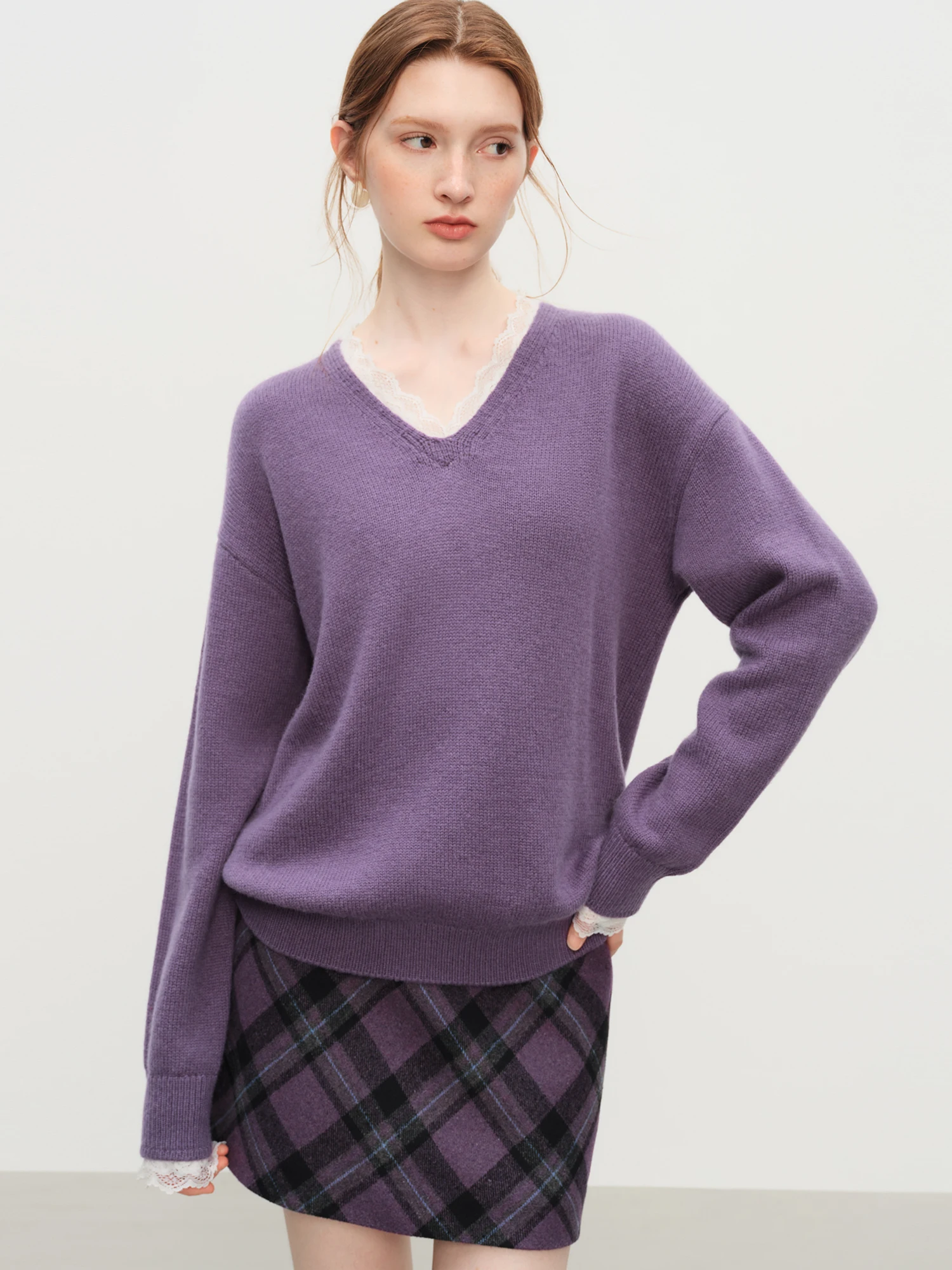 Introducing the Women’s V-Neck Lace Knit Wool Blend Sweater, a refined piece designed for the modern woman who values both elegance and comfort. This sweater features a relaxed, regular fit that drapes naturally, making it an ideal choice for winter office wear or sophisticated casual settings.