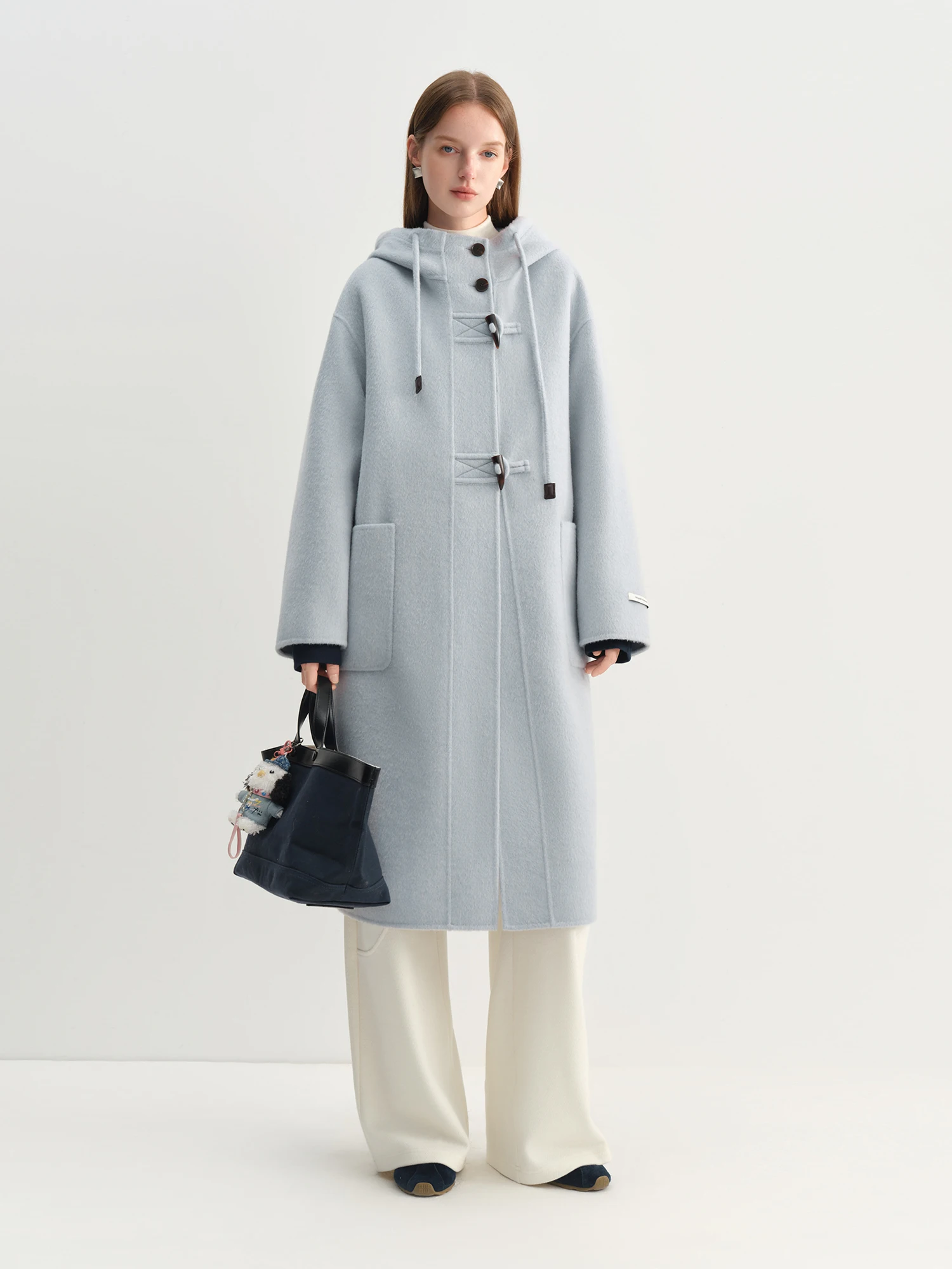 Available in elegant camel and soft sky blue, the coat features toggle-style horn buttons and a turn-down collar, complementing office attire or weekend ensembles with understated sophistication.