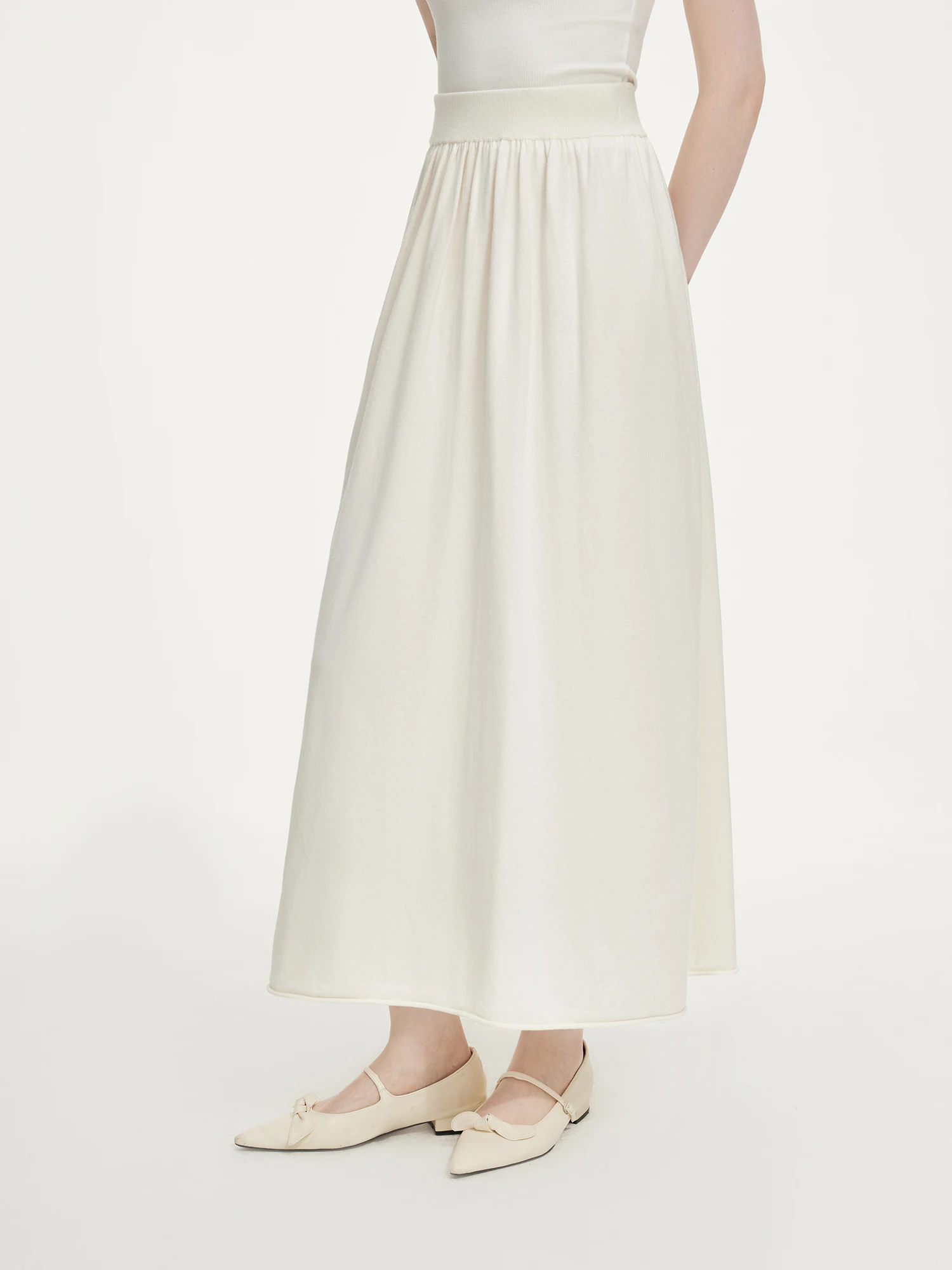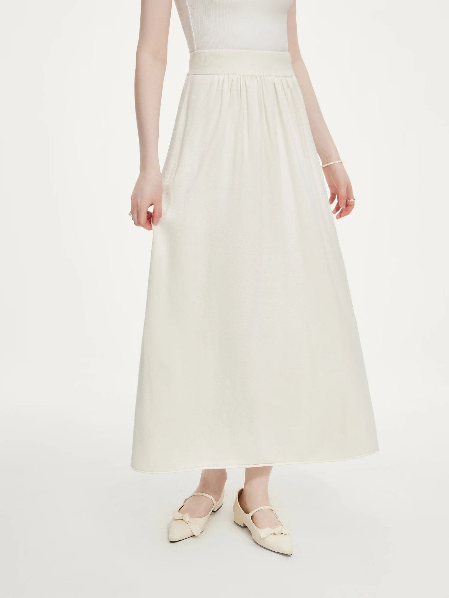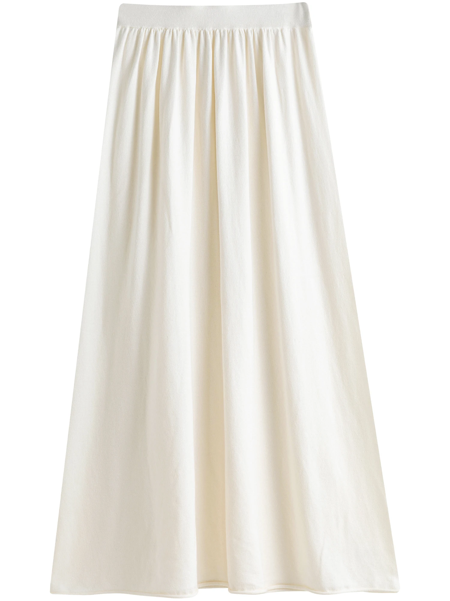 - A-line midi skirt with elastic waistband for adaptable comfort and movement