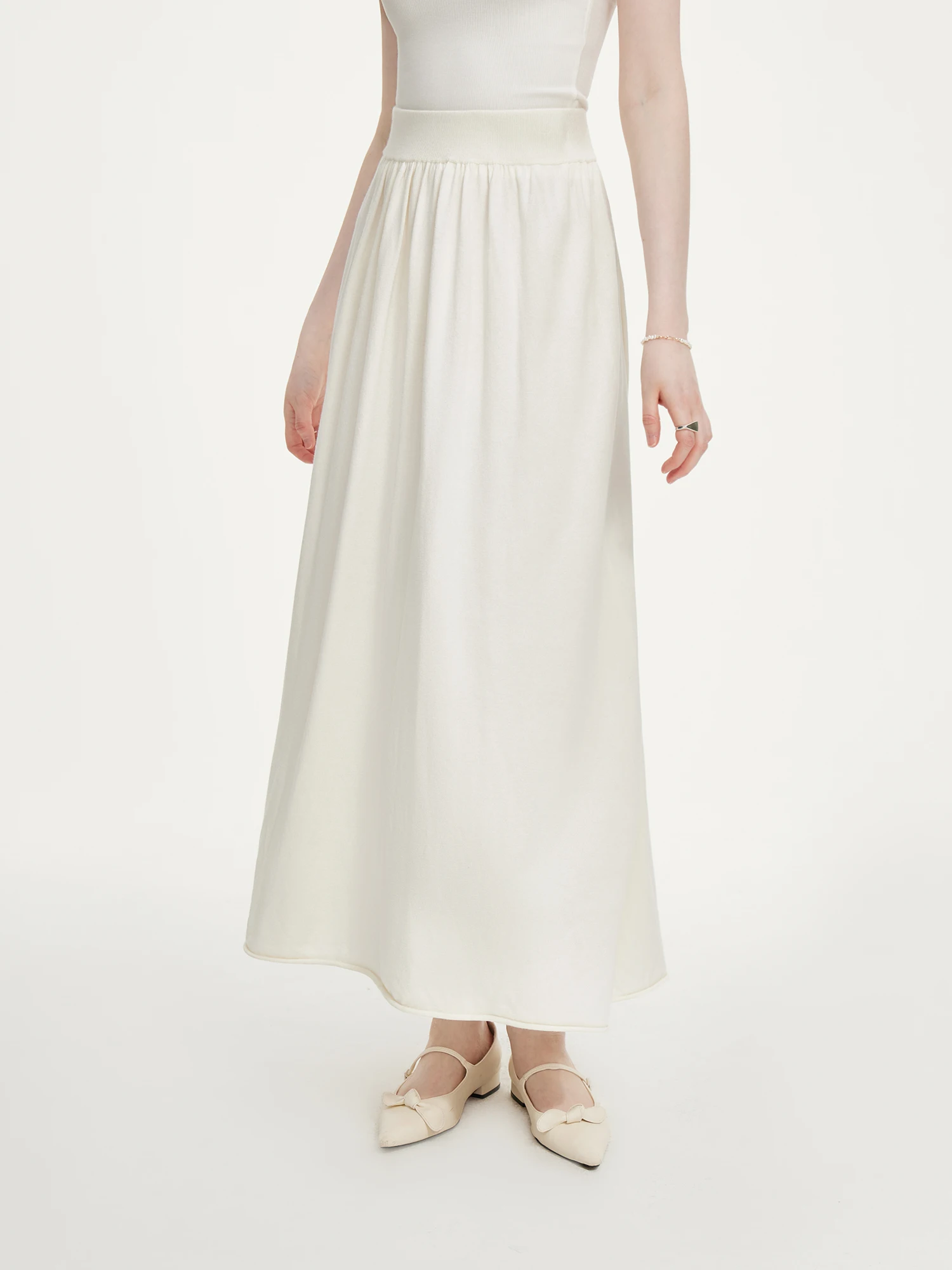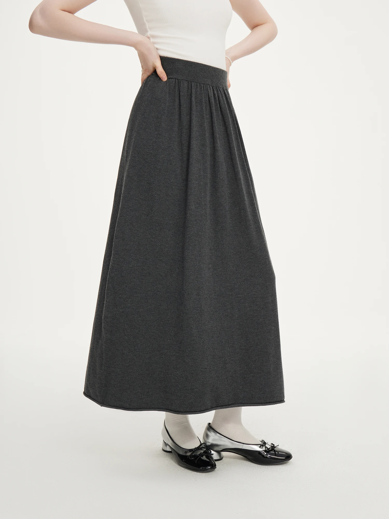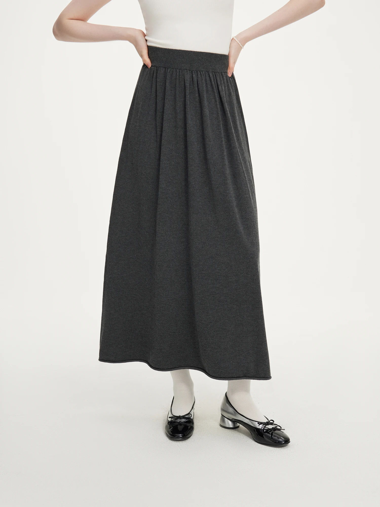 - A-line midi skirt with elastic waistband for adaptable comfort and movement