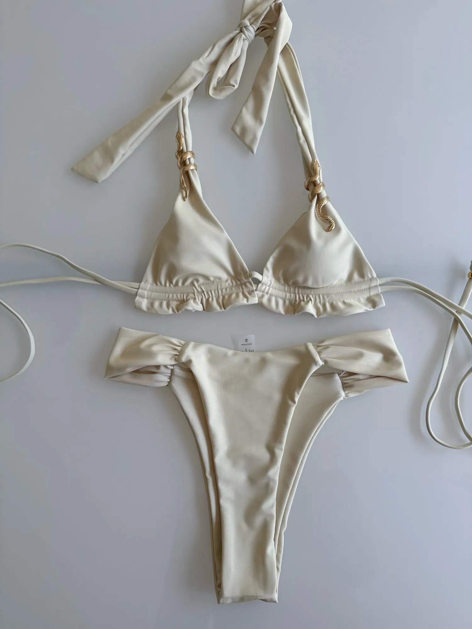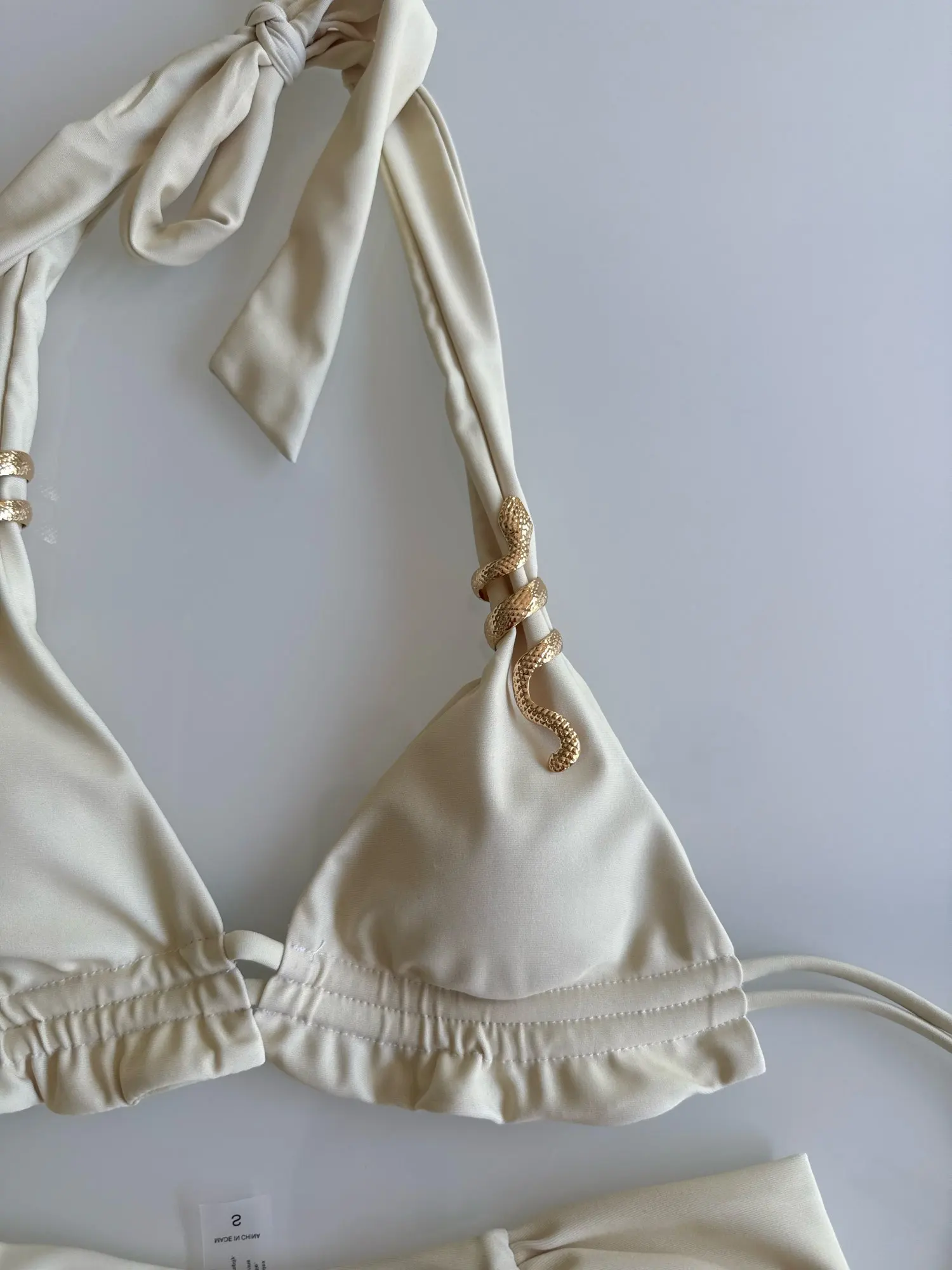 - Knotted bandeau top with elegant gold detail