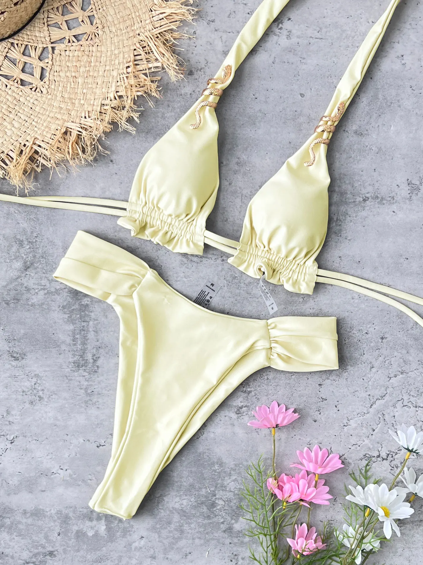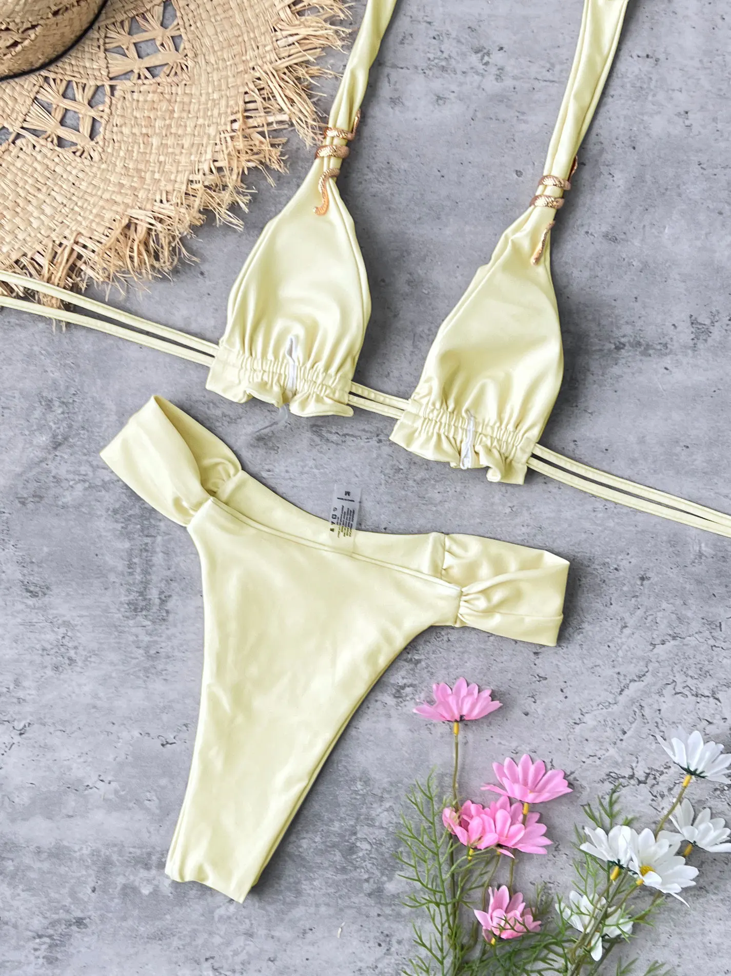 This Yellow Knotted Bandeau Bikini Set with Gold Accent is designed for women seeking a refined beach style with a modern touch. Crafted from a blend of elastane and terylene, it offers a comfortable fit that holds its shape well. The underwire support and padded cups ensure a secure and flattering silhouette, suitable for mid-waist preference.