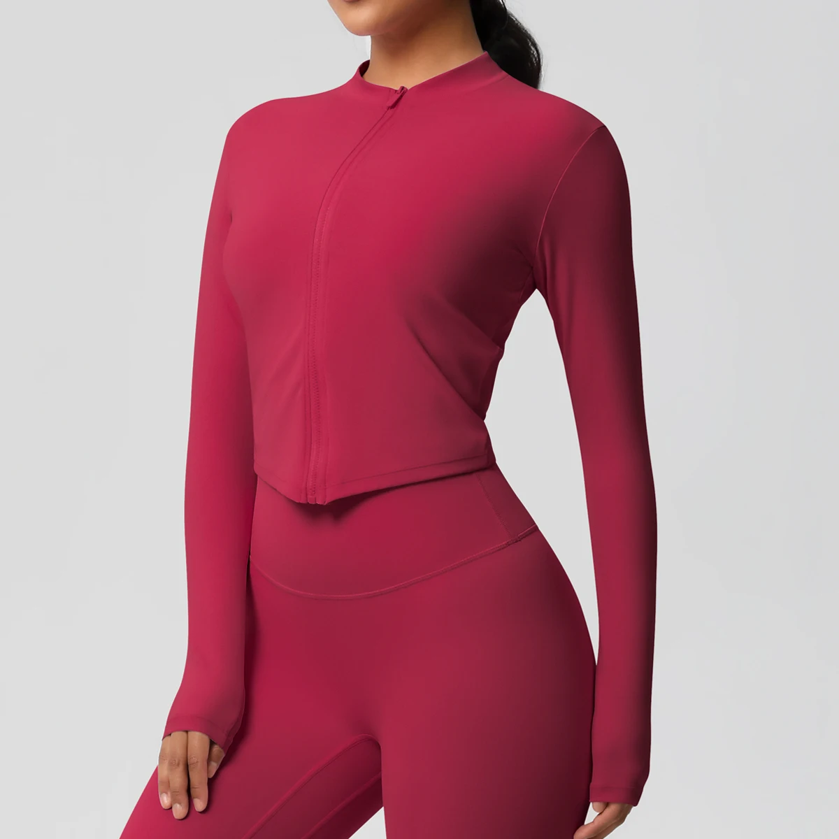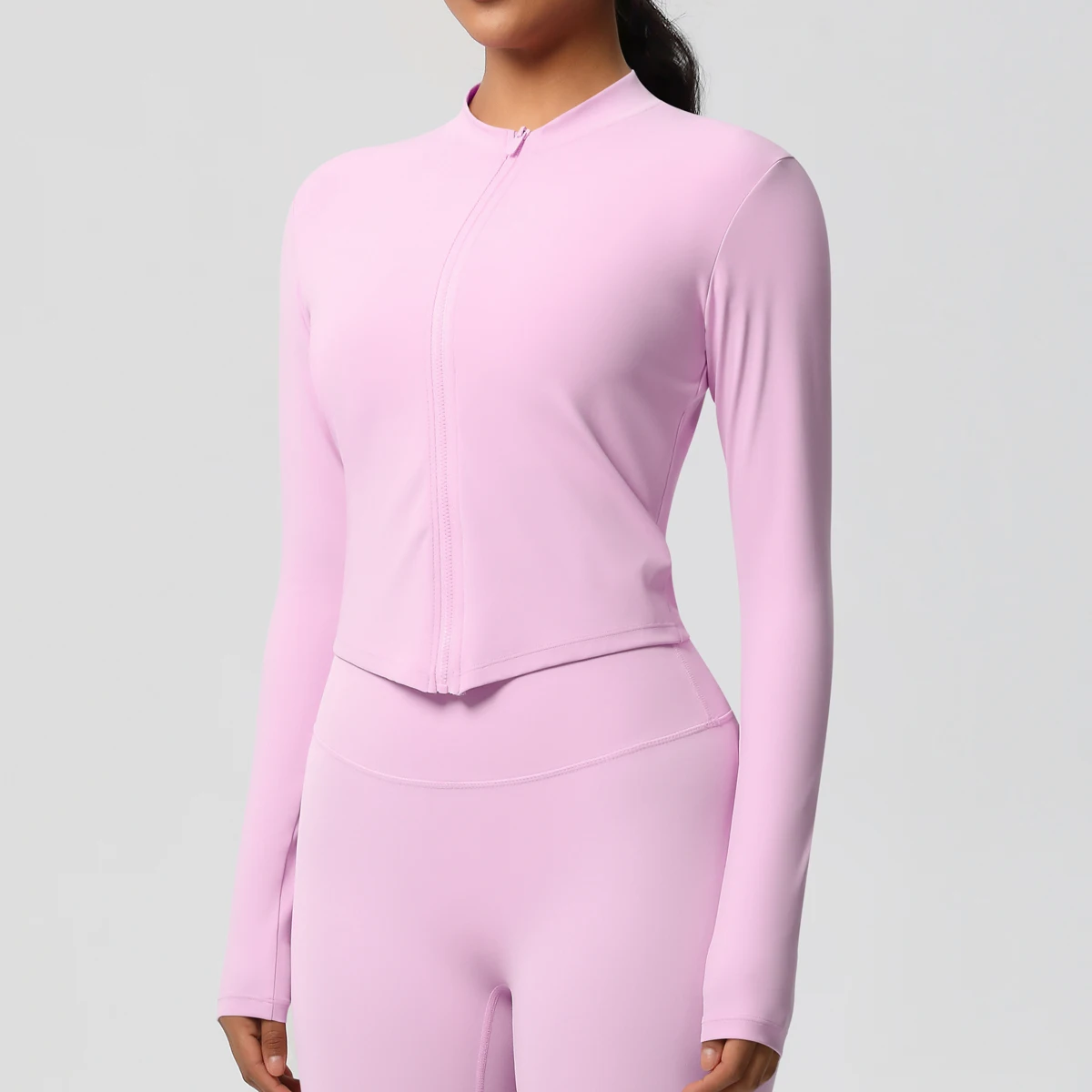 Unleash your potential with this seamless crop top jacket, designed for a luxurious workout experience. Crafted from high-stretch nylon and spandex, it offers a flattering silhouette in various chic colors. Ideal for all seasons, this elegant piece combines style and functionality, ensuring you stay confident and comfortable during any activity. Perfect for the modern woman on the go.